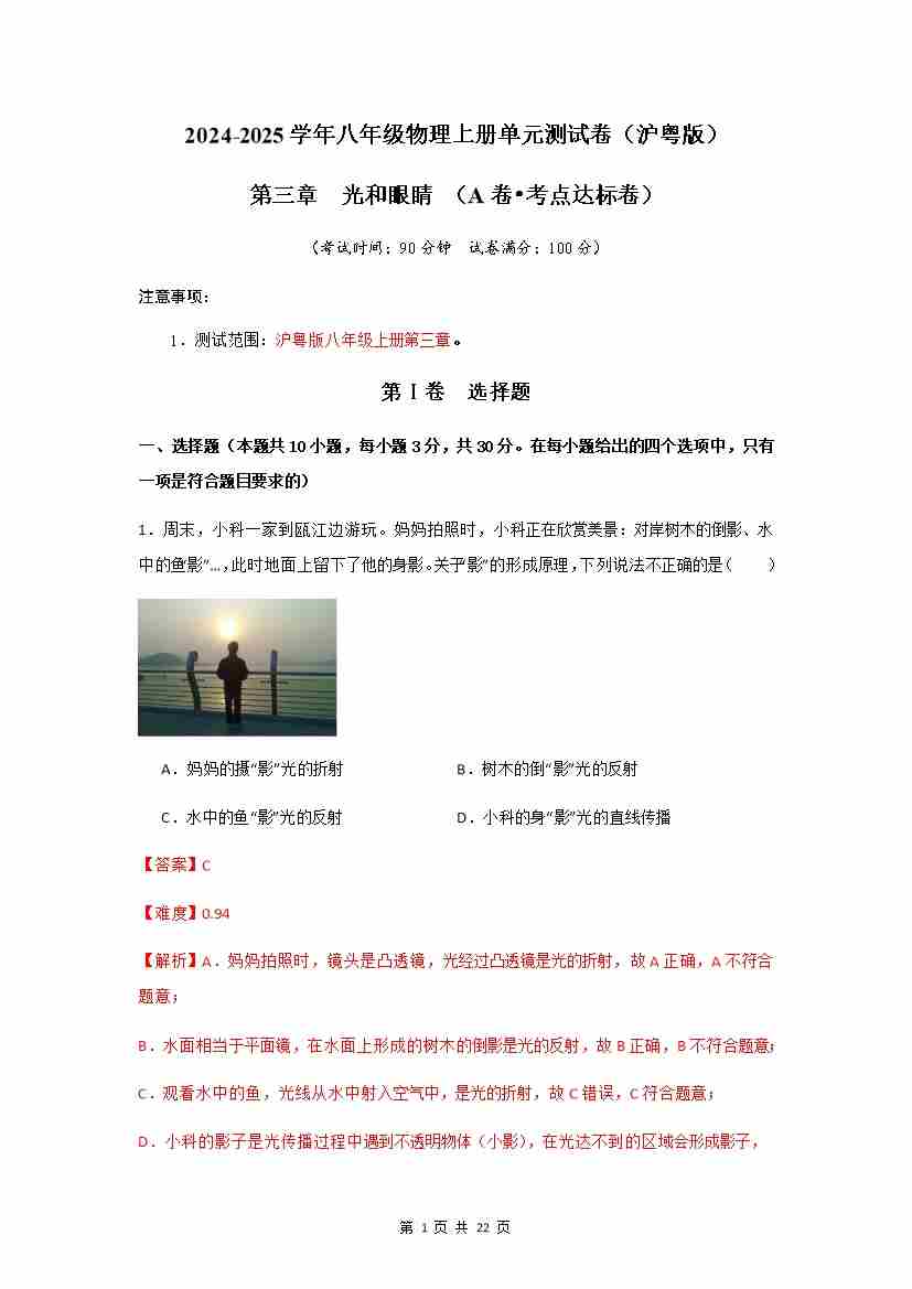 第3章 光和眼睛-【A卷 达标卷】(原卷A4版)