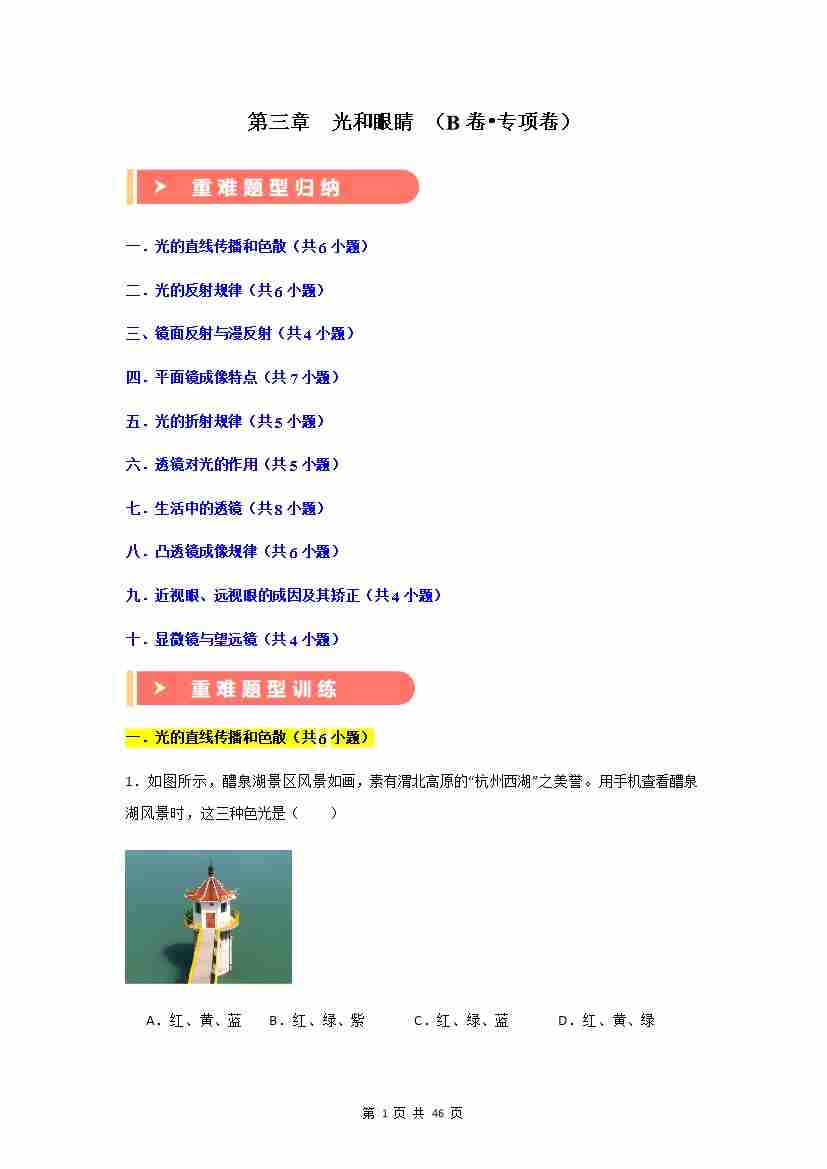 第3章 光和眼睛【B卷 专项卷】(重难训练54题10大考点)(原卷版)