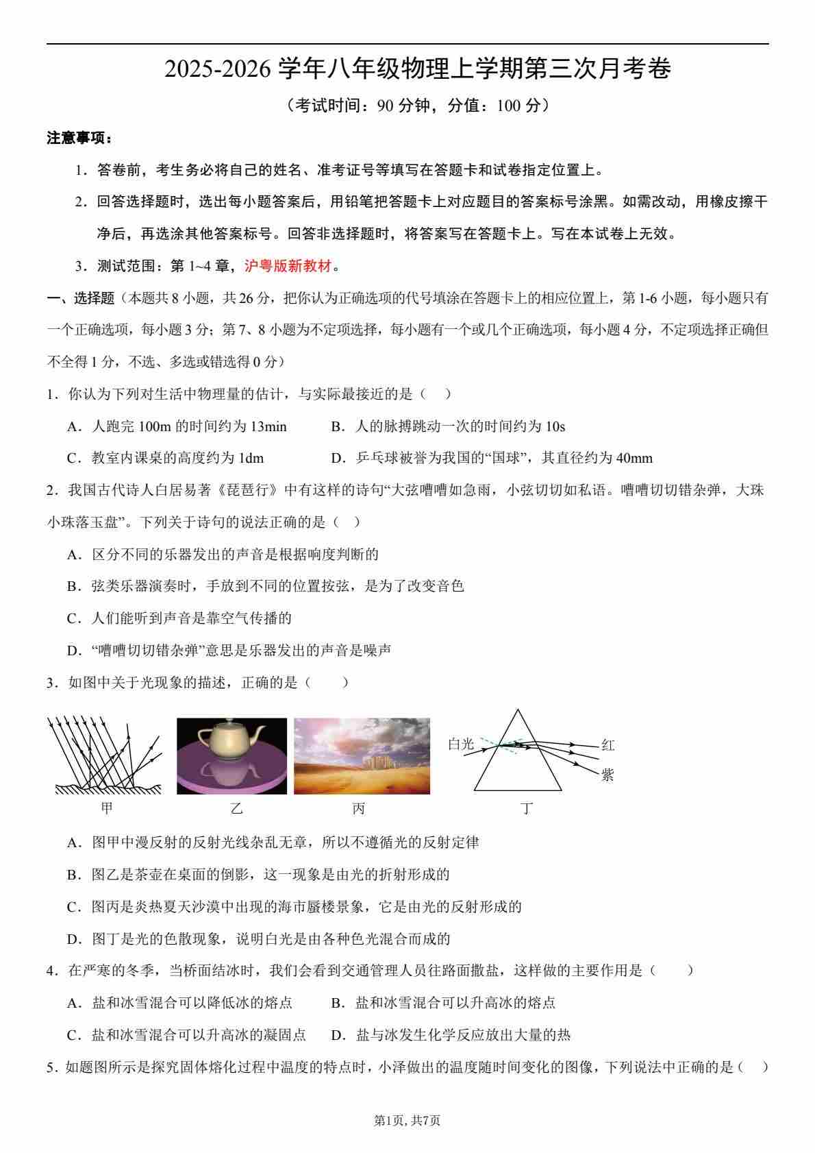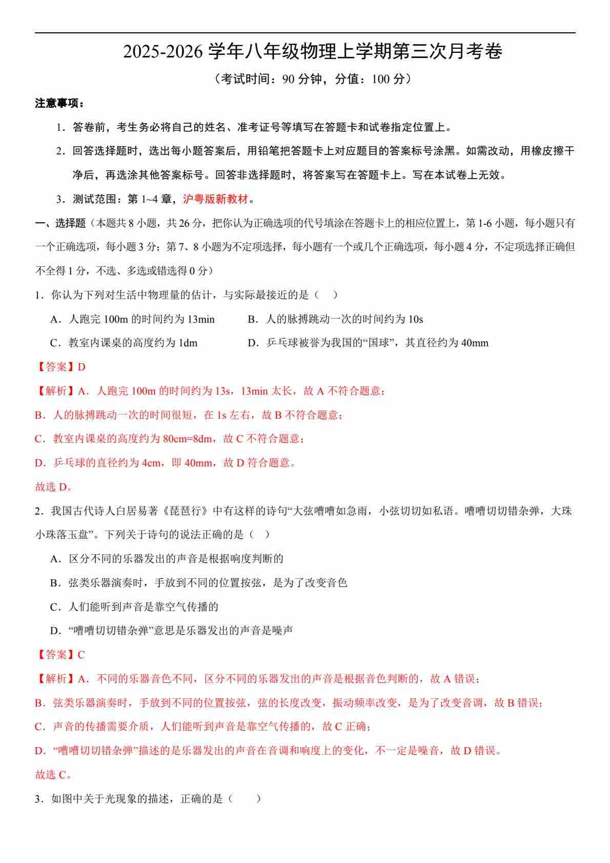 八年级沪粤物理上学期第三次月考【测试范围:八上第1-4章】(考试版)(考试版)