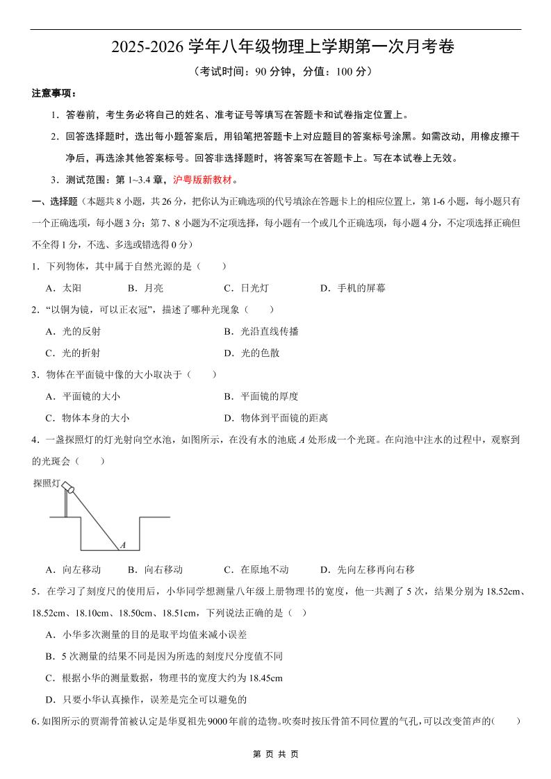 八年级沪粤物理上学期期中模拟卷【测试范围:八上第1-3.4章】(考试版)(考试版)