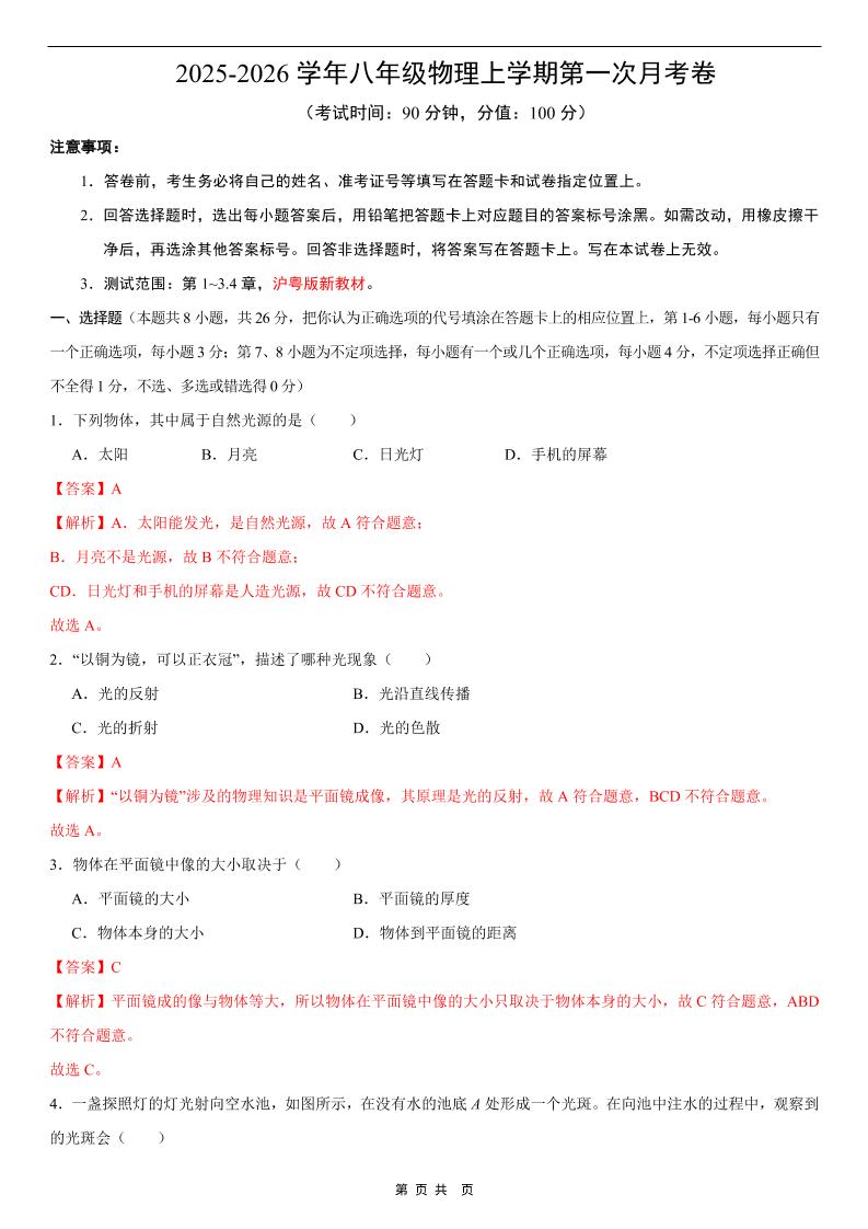 【沪粤】8上物理期中卷【1-3章】