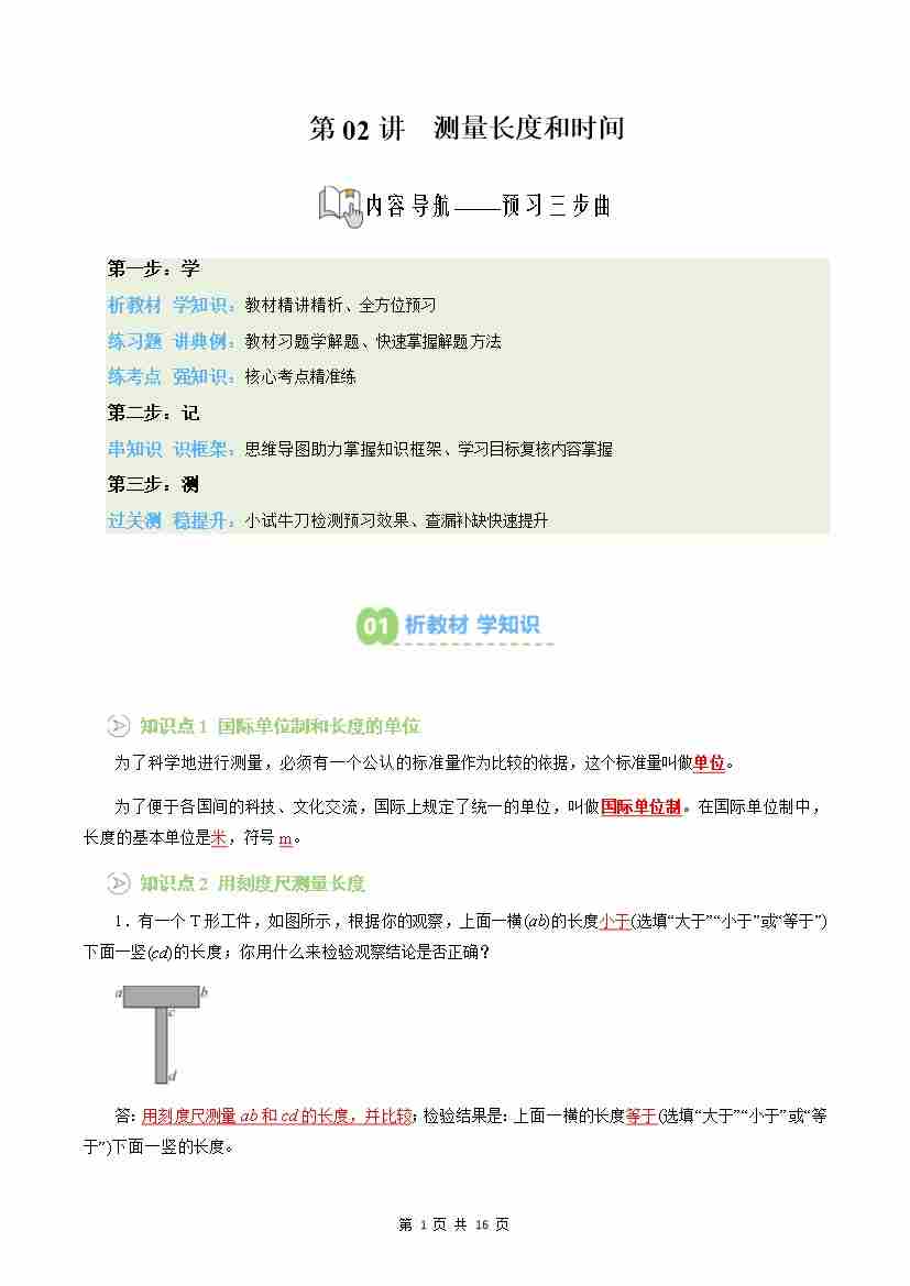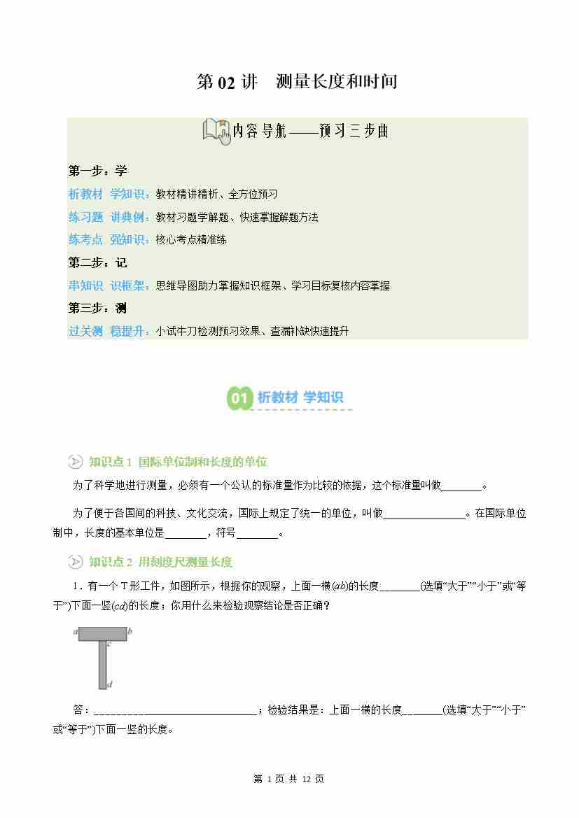 第02讲:测量长度和时间(预习)(原卷版)