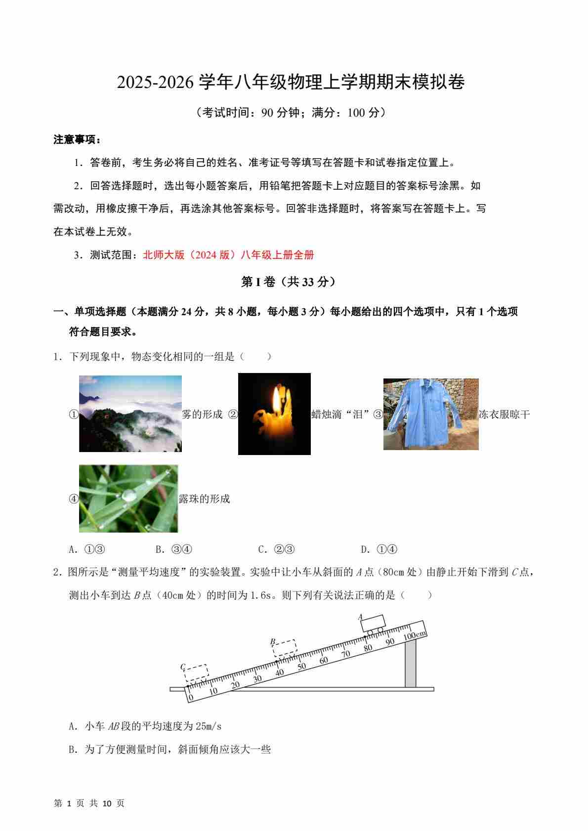 2025-2026八上物理【北师大版】期末模拟卷(原卷版)