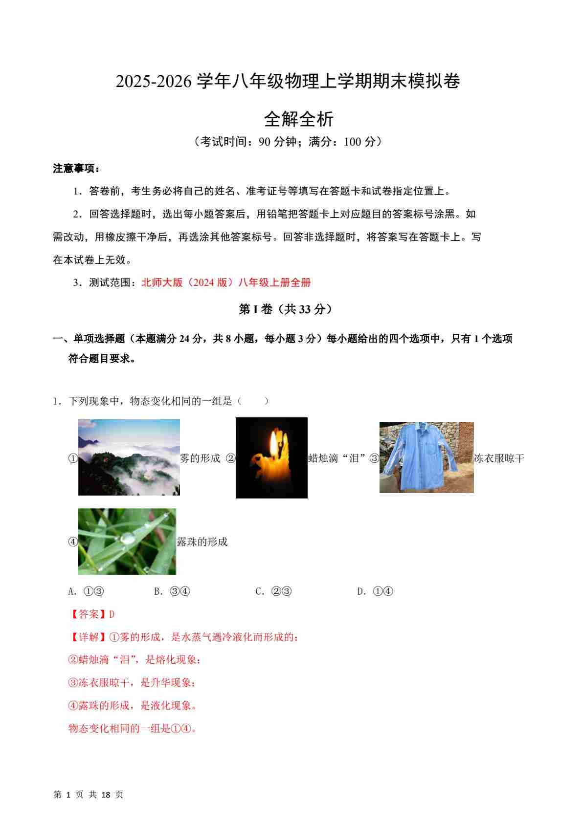 2025-2026八上物理【北师大版】期末模拟卷(解析版)