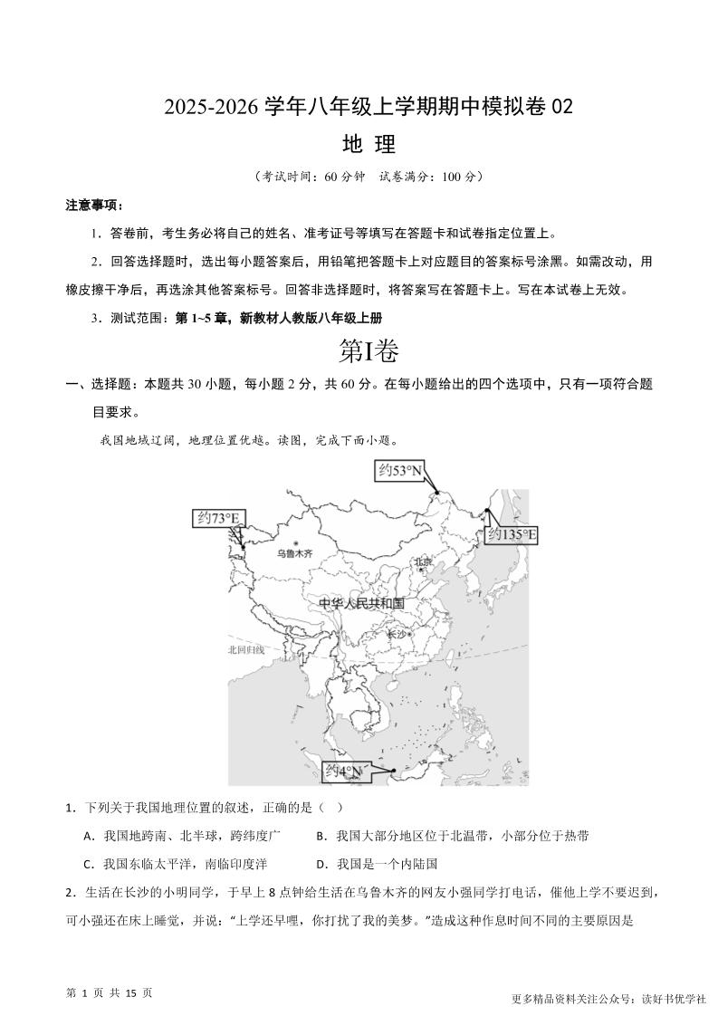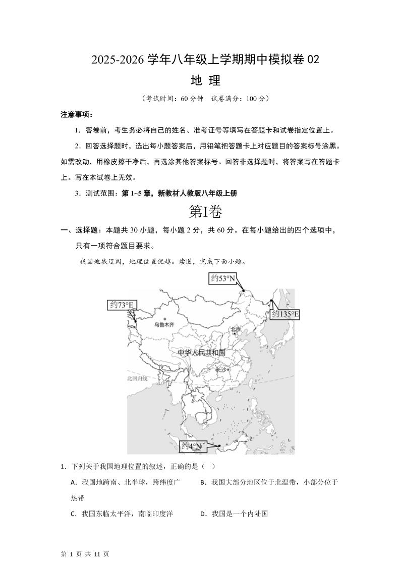 八年级地理上学期期中模拟卷02(新教材人教版)(考试版)