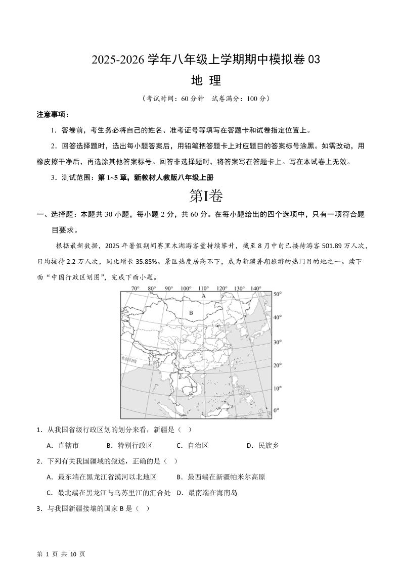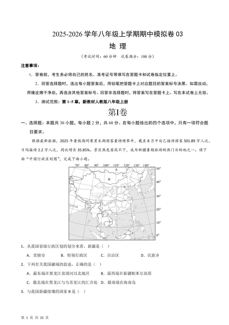 八年级地理上学期期中模拟卷03(新教材人教版)(考试版)