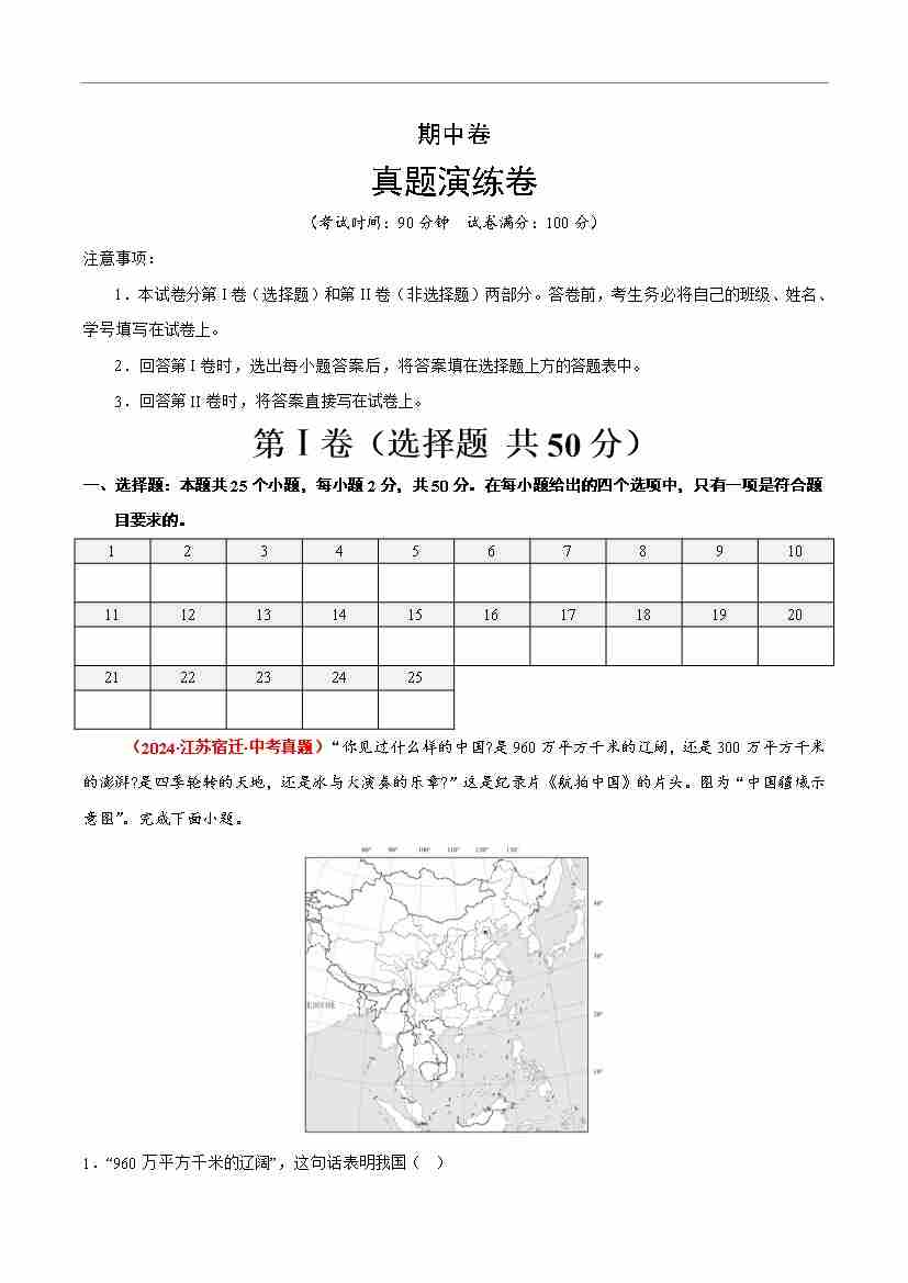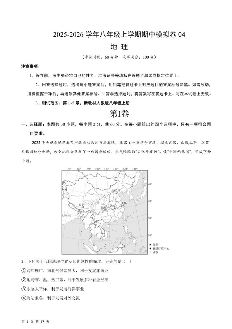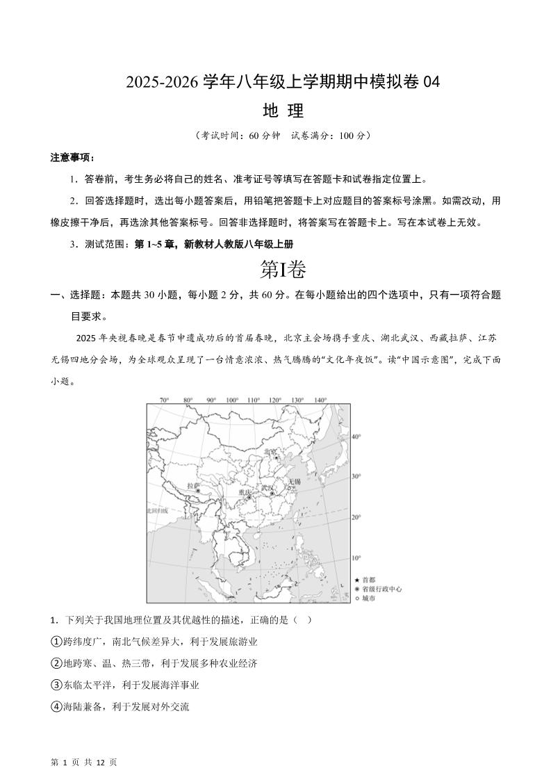 期中卷【真题演练】-2025-2026学年八年级地理上册单元测试定心卷(人教版2024)(原卷版)