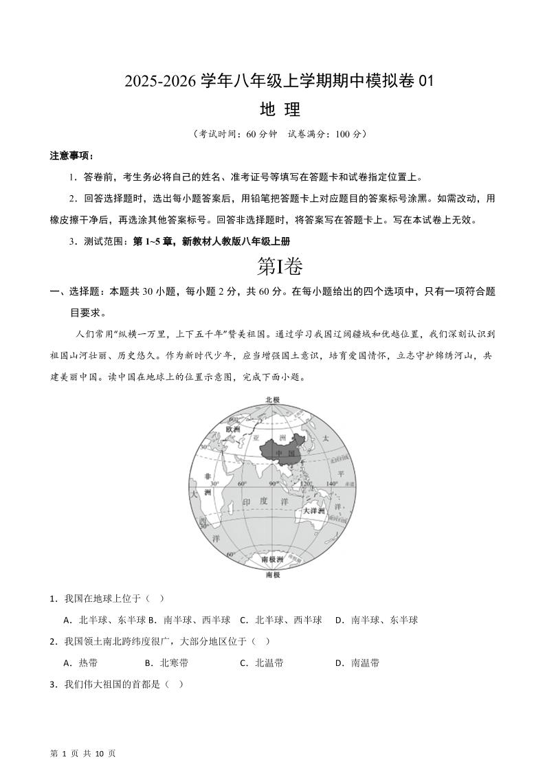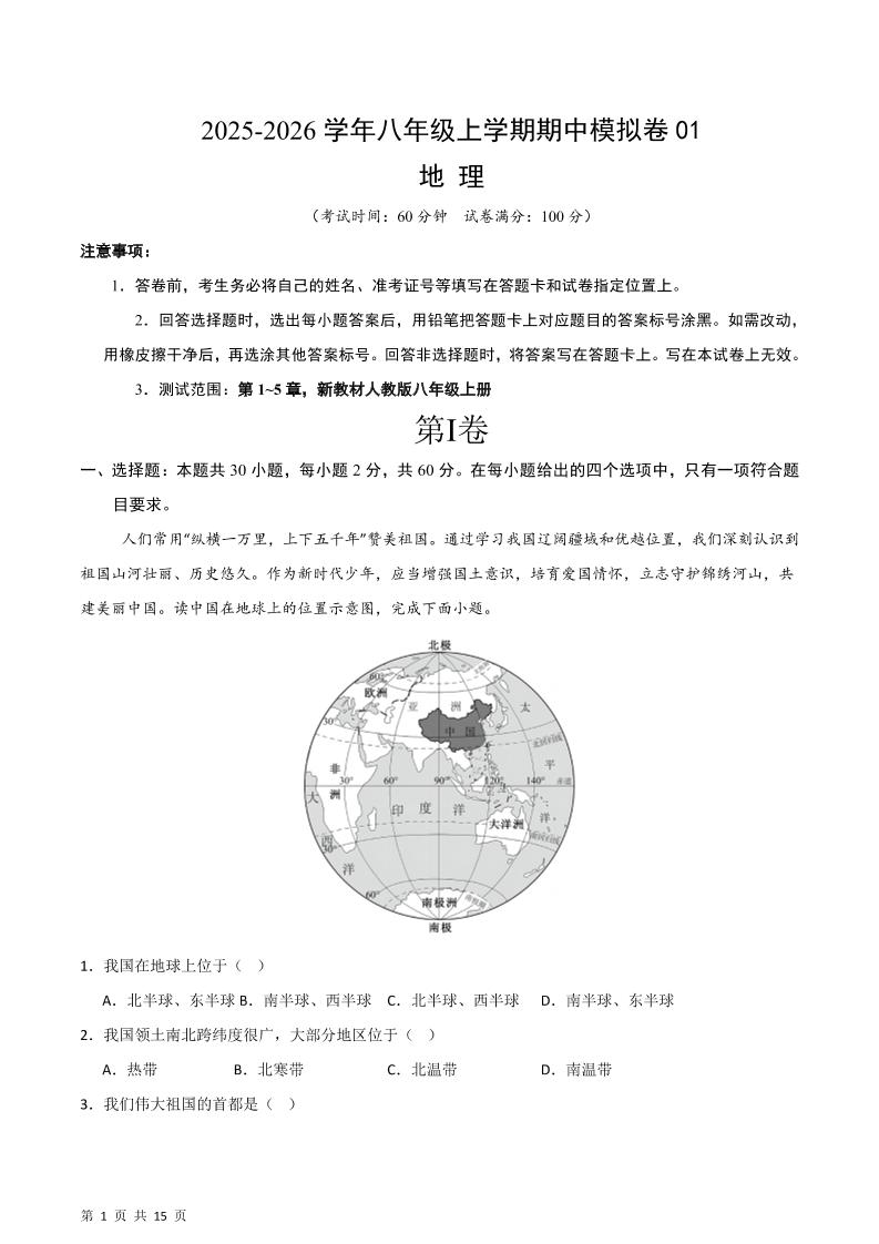 八年级地理上学期期中模拟卷01(新教材人教版)(考试版)