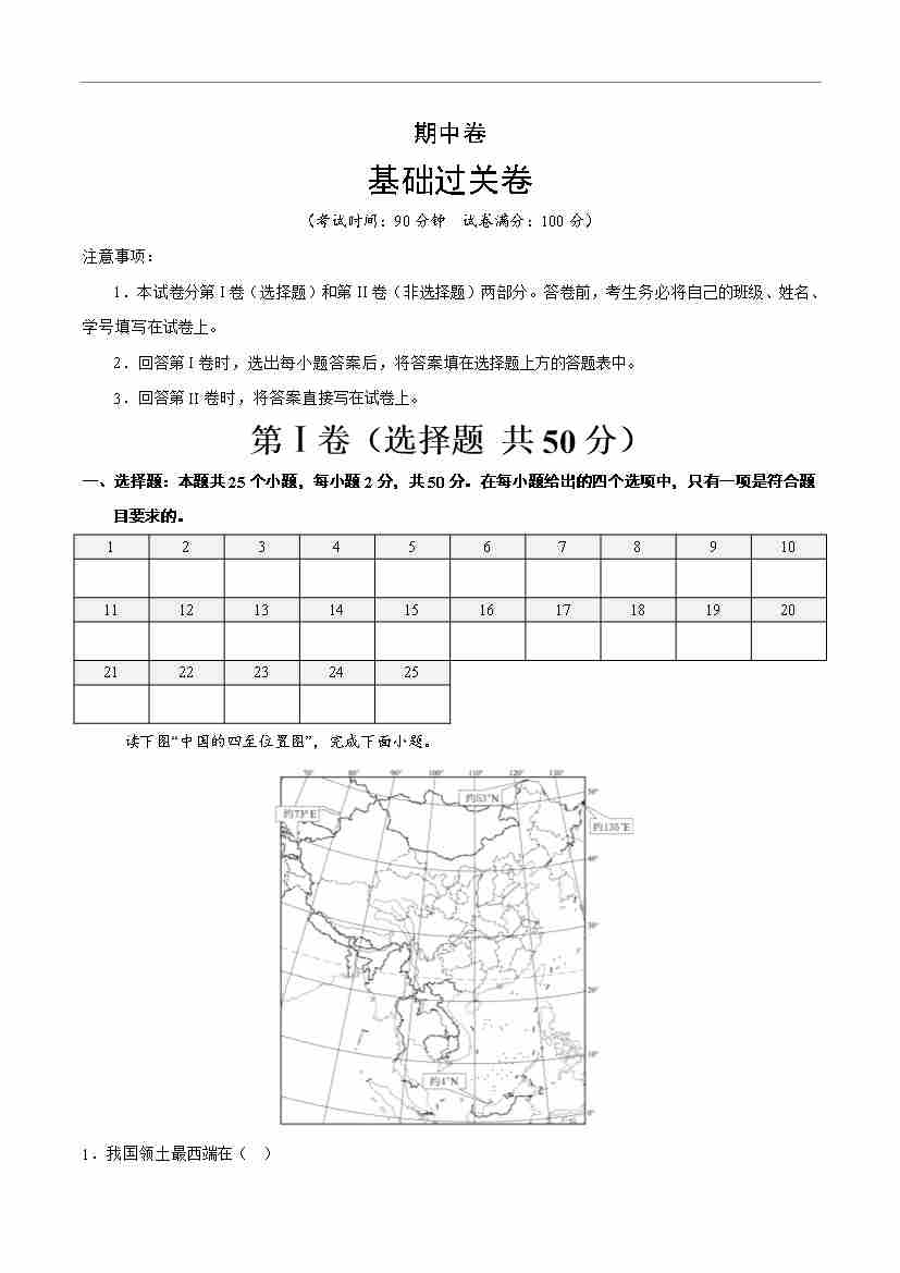 期中卷【基础过关】-2025-2026学年八年级地理上册单元测试定心卷(人教版2024)(原卷版)