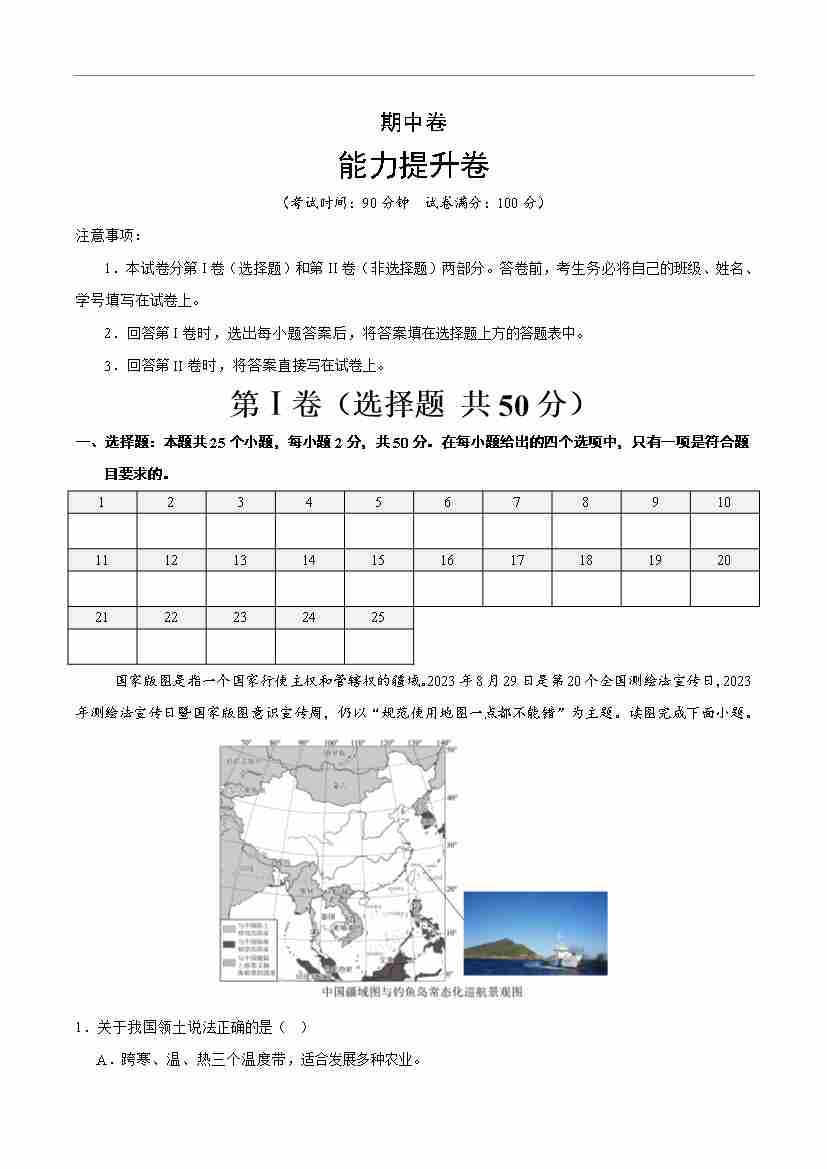 期中卷【能力提升】-2025-2026学年八年级地理上册单元测试定心卷(人教版2024)(原卷版)