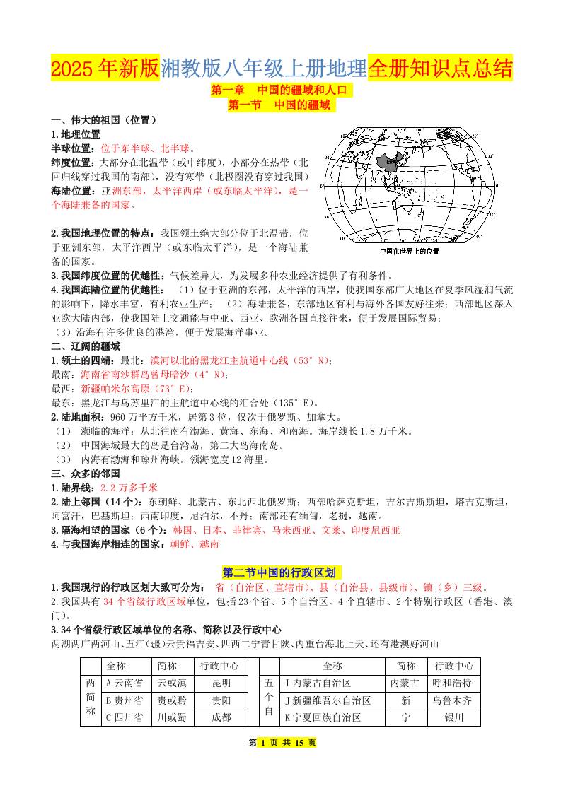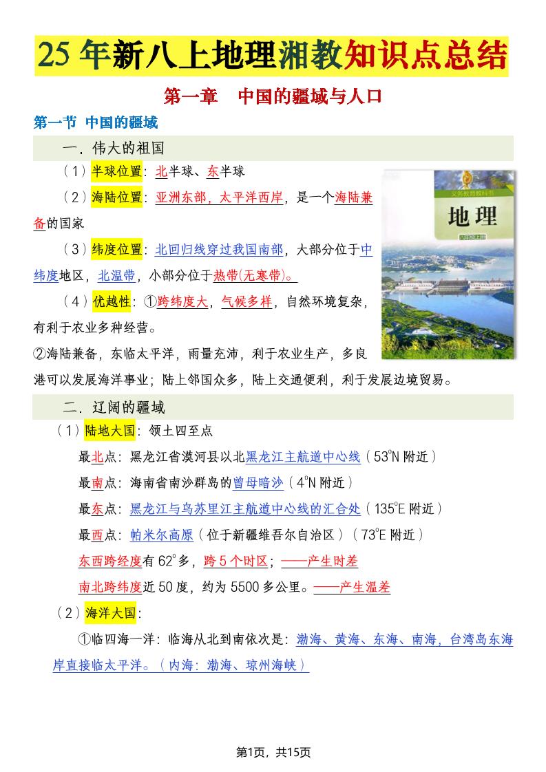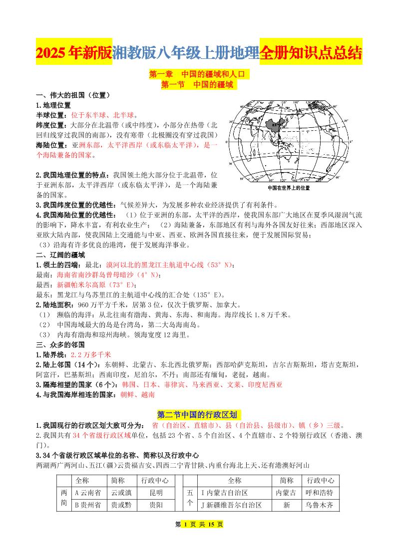 【湘教】新教材八上地理知识点总结,