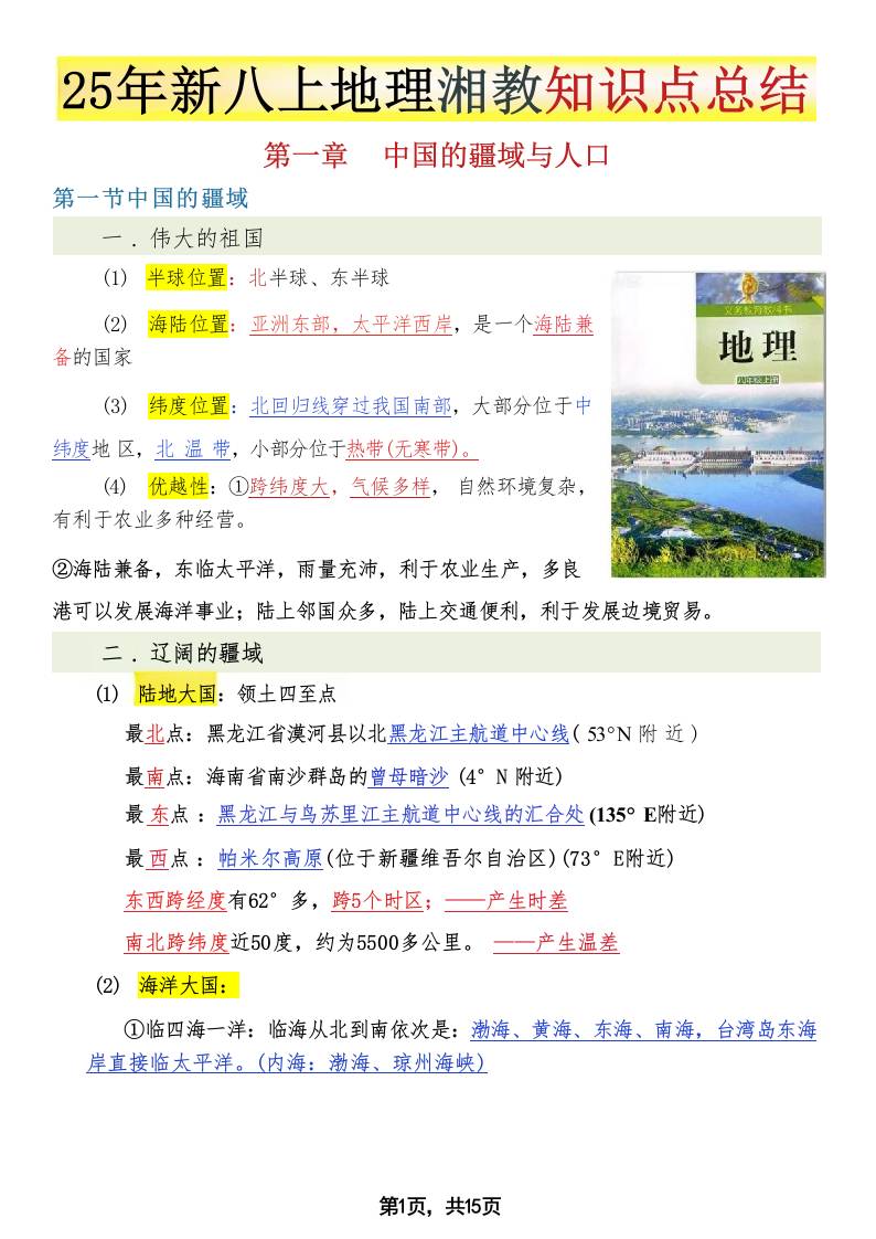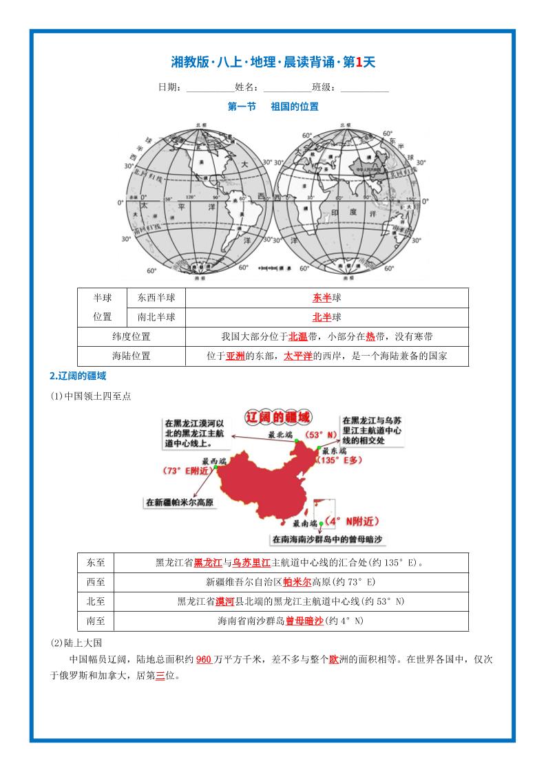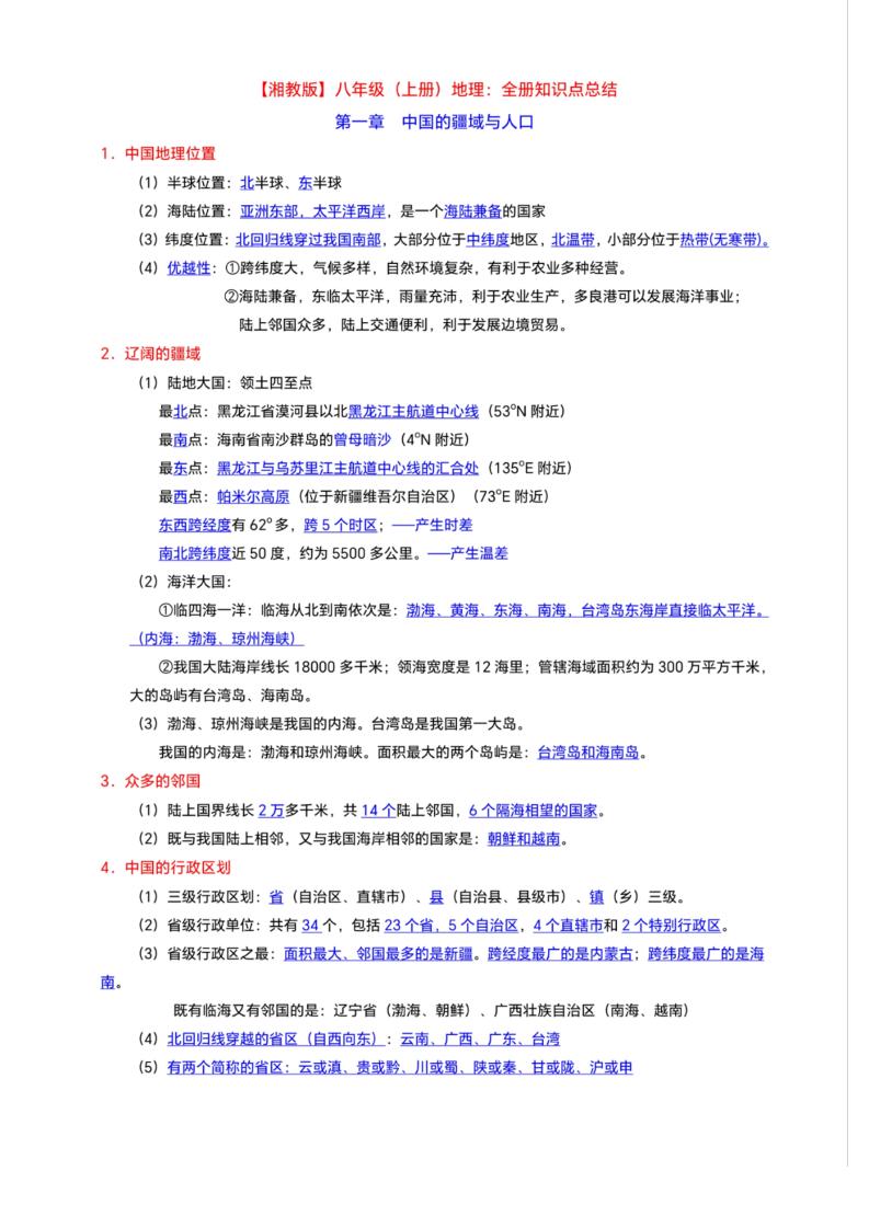 【湘教版地理】八上知识点背诵版