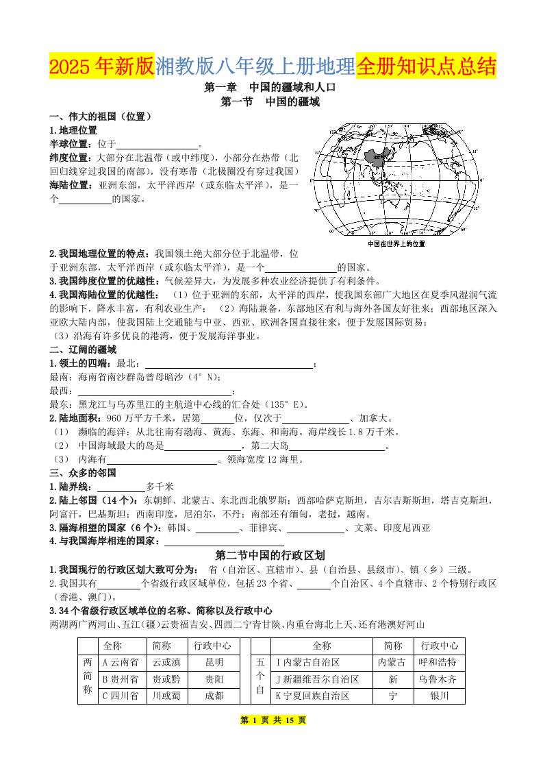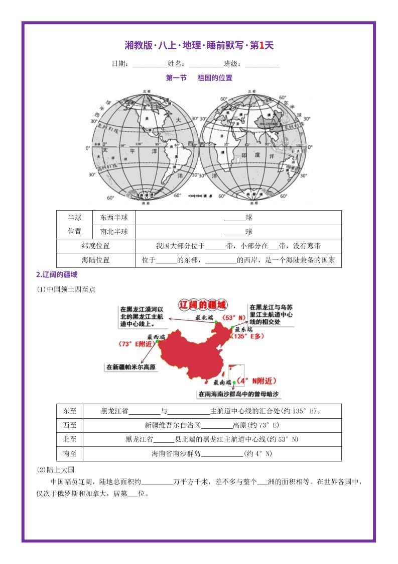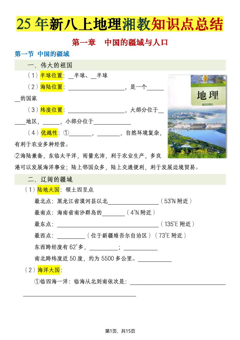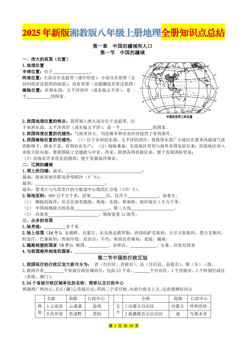 【湘教版地理】八上知识点默写版