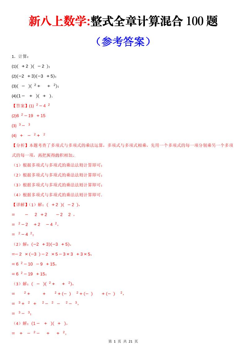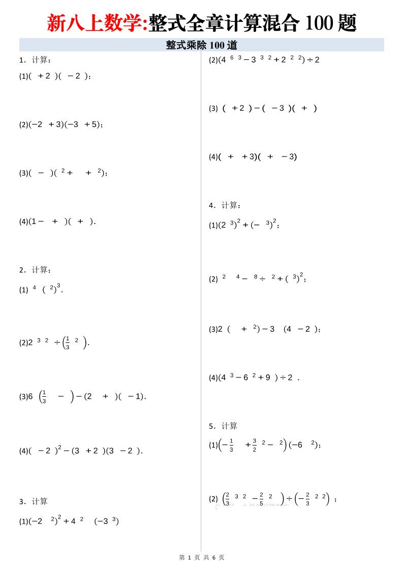 整式的乘除全章计算题混合刷题训练(精选100道)原卷版