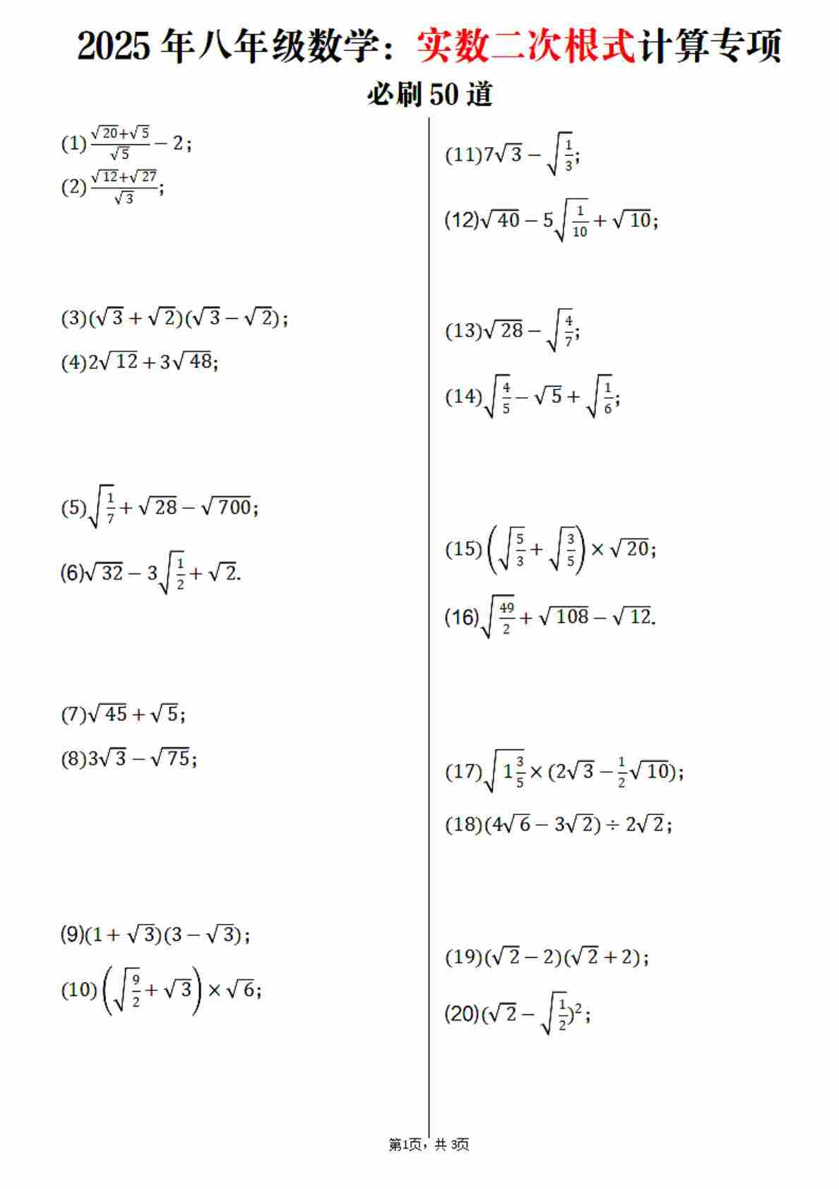 2025年北师大新课标八年级实数二次根式计算专项50道4