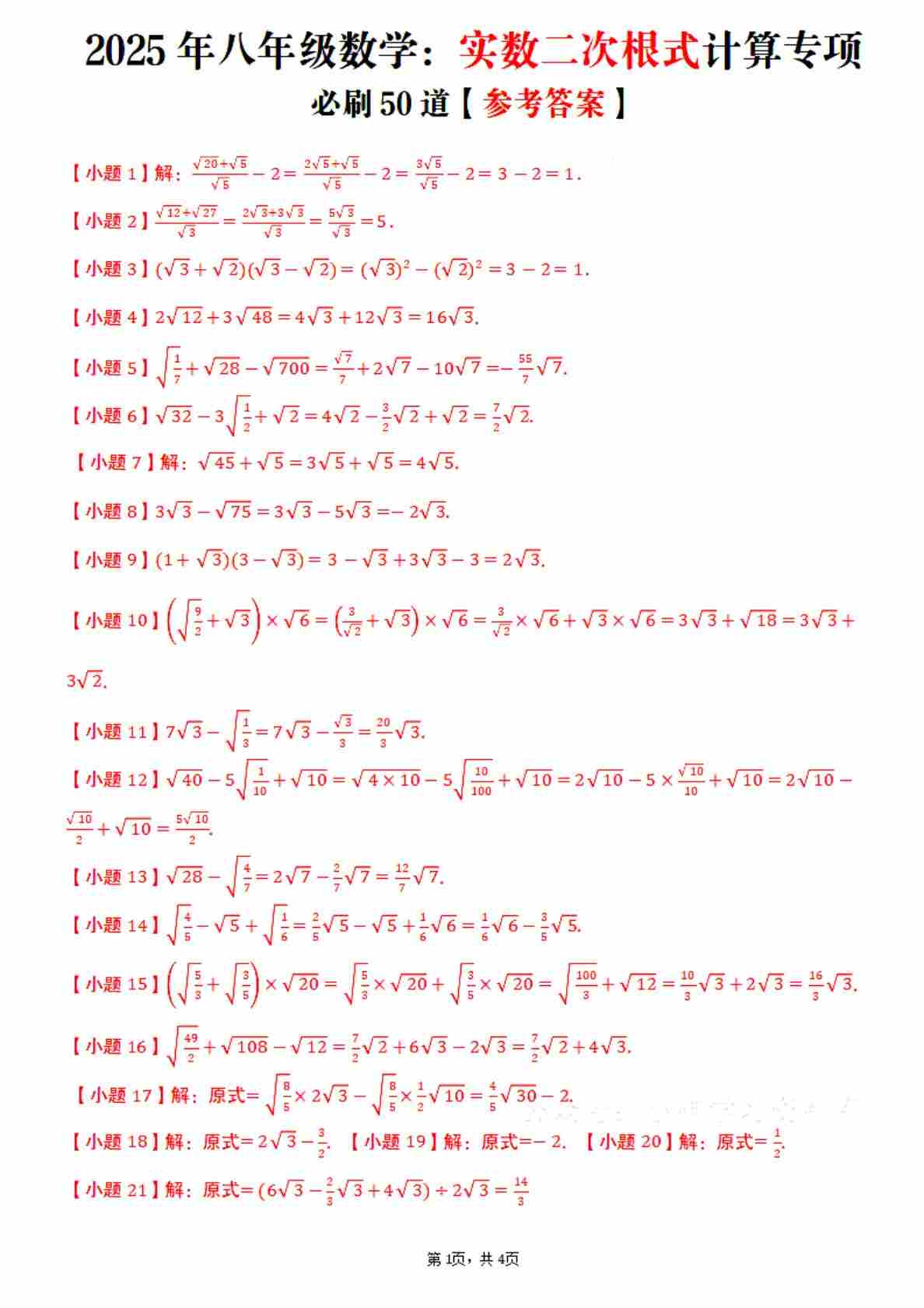 2025年北师大新课标八年级实数二次根式计算专项50道参考答案4