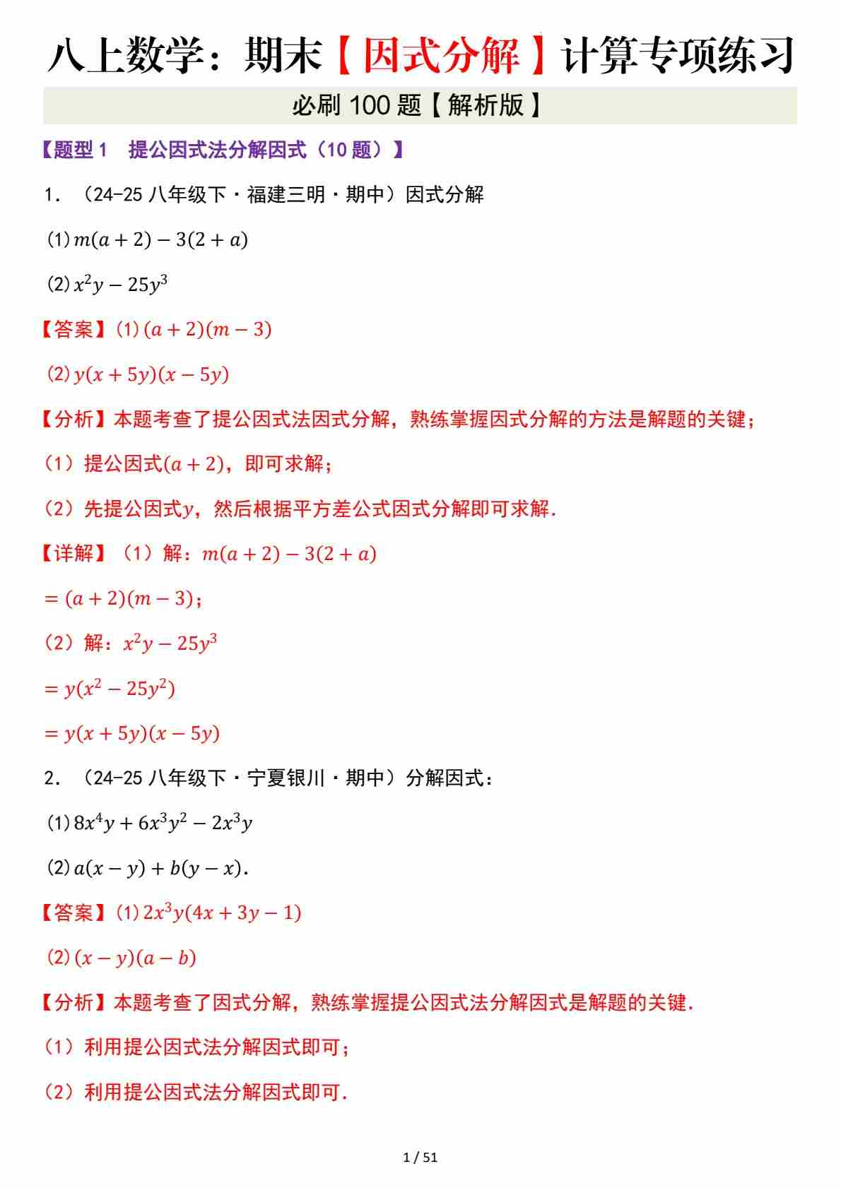2025八上数学因式分解计算100题