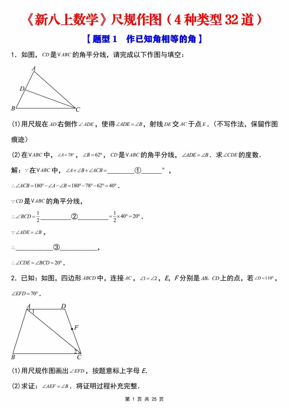 八上数学角度计算模型之角平分线小纸条【空白】