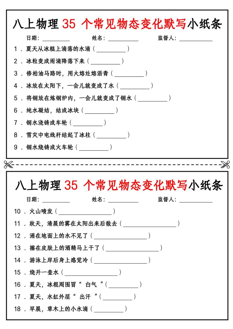 八上物理35 个常见物态变化默写小纸条【空白版】