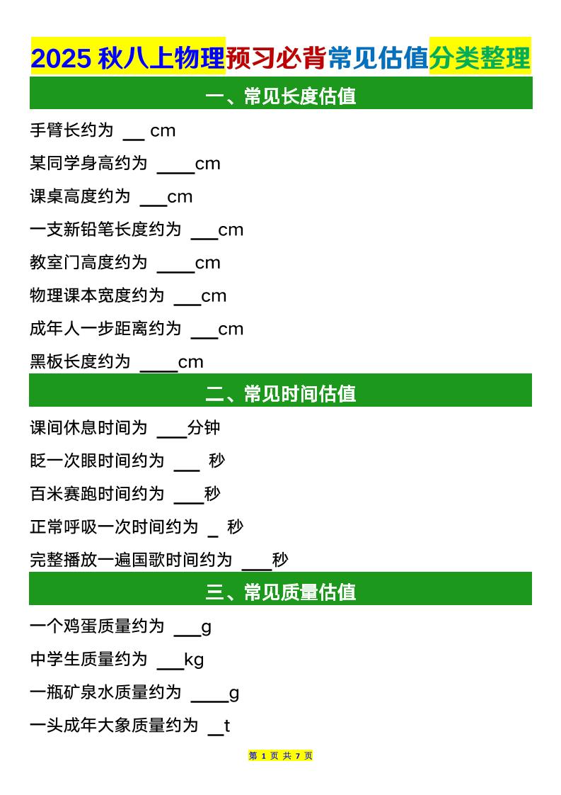 2025秋八上物理预习必背常见估值分类整理