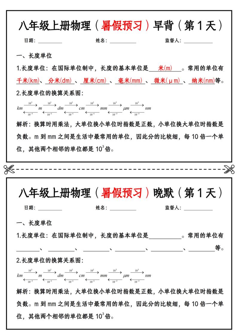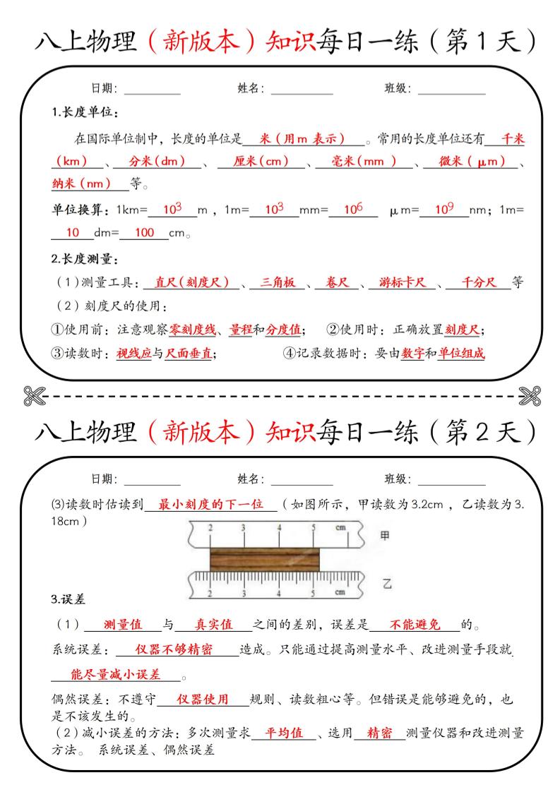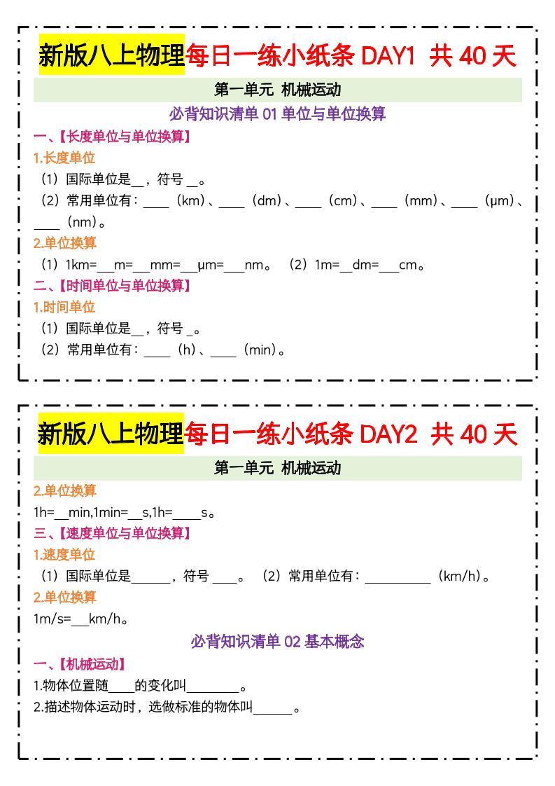 【期中】新版八上物理每日一练小纸条(空白)