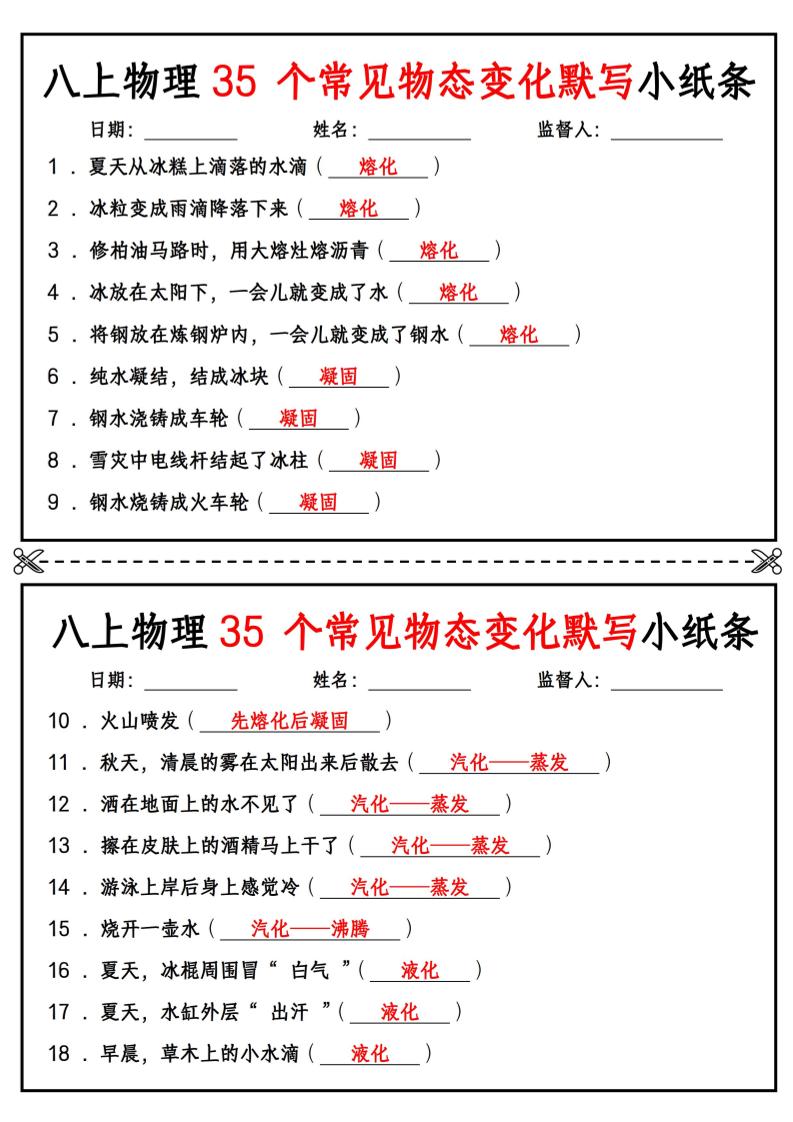 八上物理35 个常见物态变化默写小纸条【答案版】