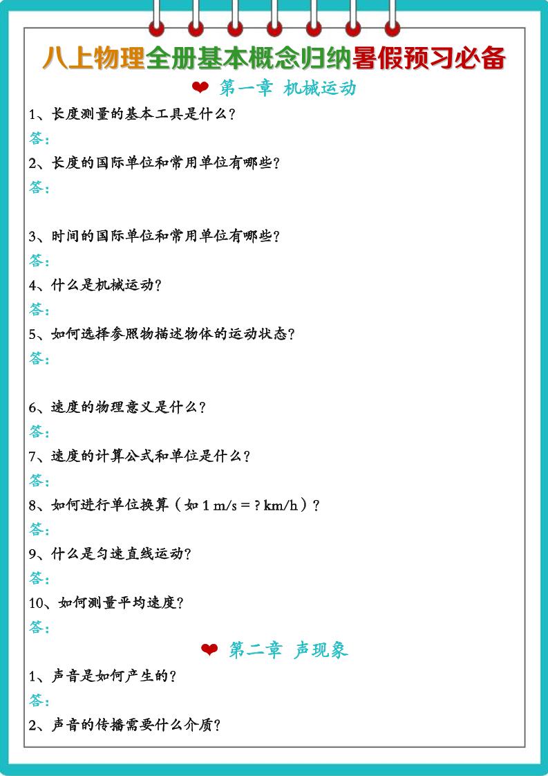 2025秋八上物理重点知识暑假预习计划