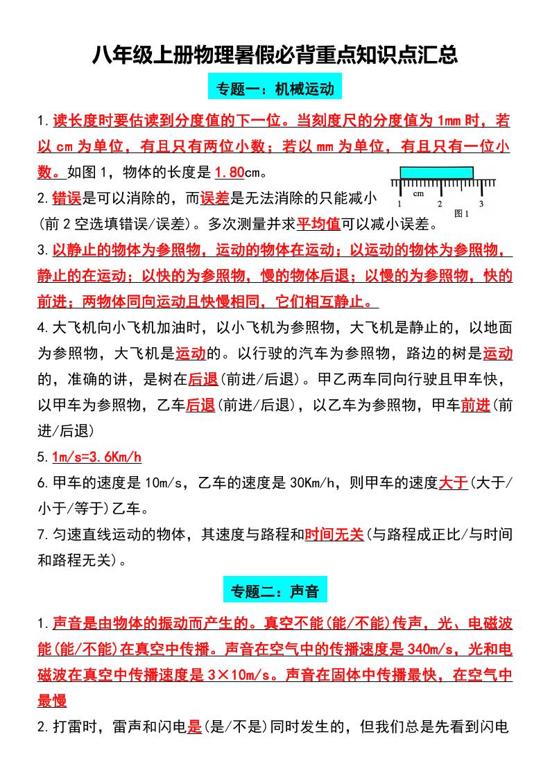 八年级上册物理暑假必背重点知识点汇总