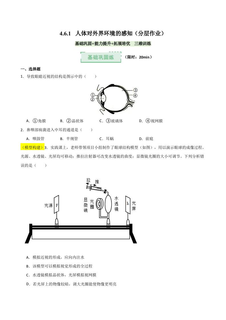 4.6.1 人体对外界环境的感知(分层作业)(原卷版)