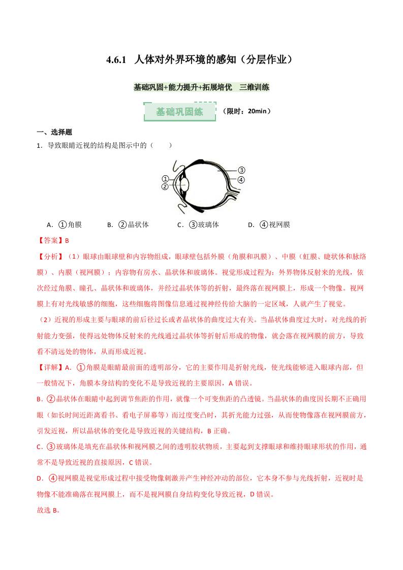 4.6.1 人体对外界环境的感知(分层作业)(解析版)