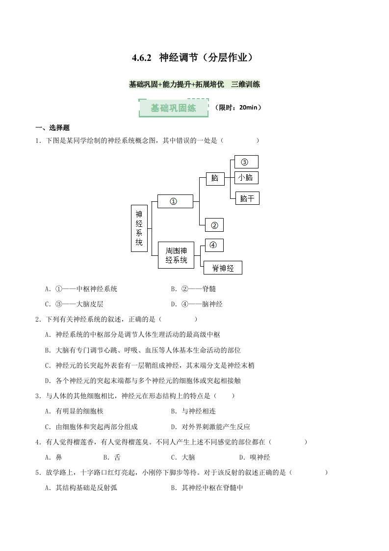 4.6.2 神经调节(分层作业)(原卷版)