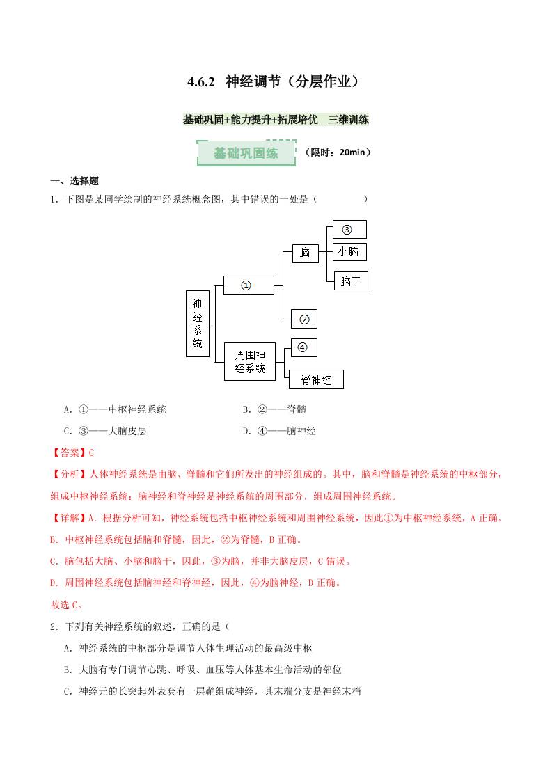 4.6.2 神经调节(分层作业)(解析版)