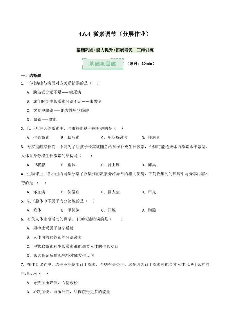 4.6.4 激素调节(分层作业)(原卷版)