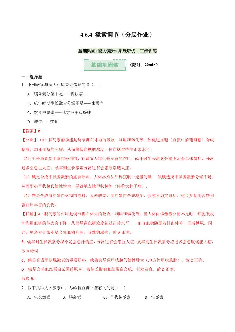 4.6.4 激素调节(分层作业)(解析版)