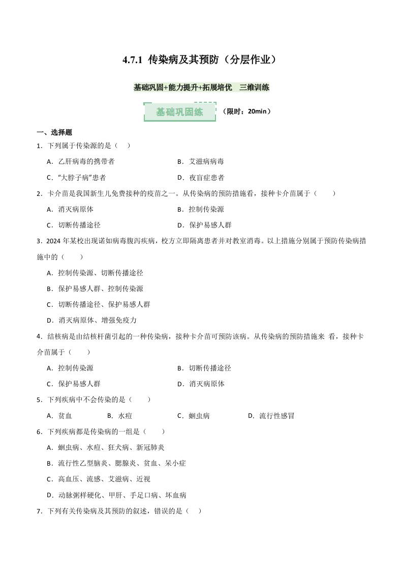 4.7.1 传染病及其预防(分层作业)(原卷版)