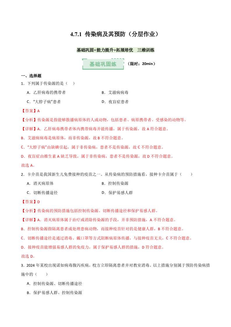 4.7.1 传染病及其预防(分层作业)(解析版)