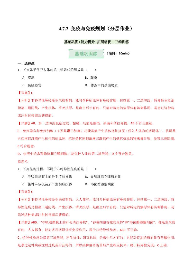 4.7.2 免疫与免疫规划(分层作业)(解析版)