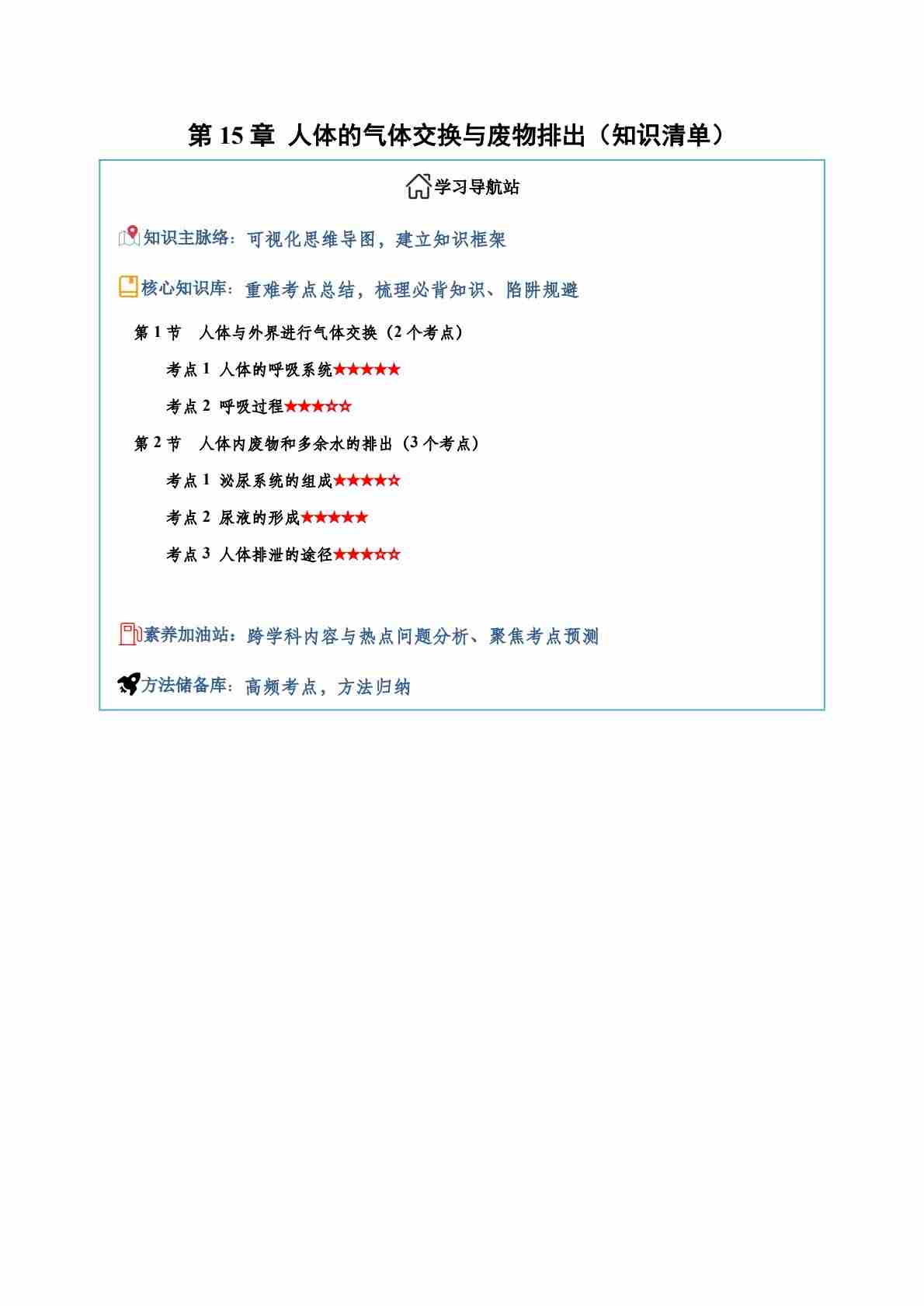第15章 人体的气体交换与废物排出(知识清单)(原卷版)