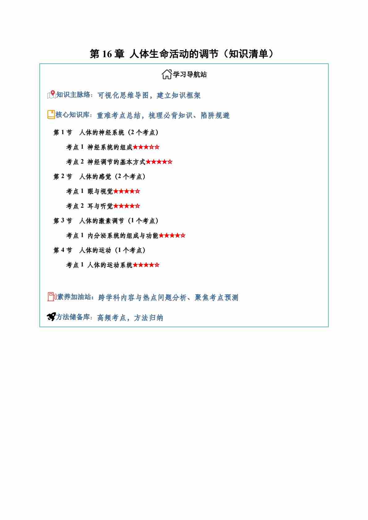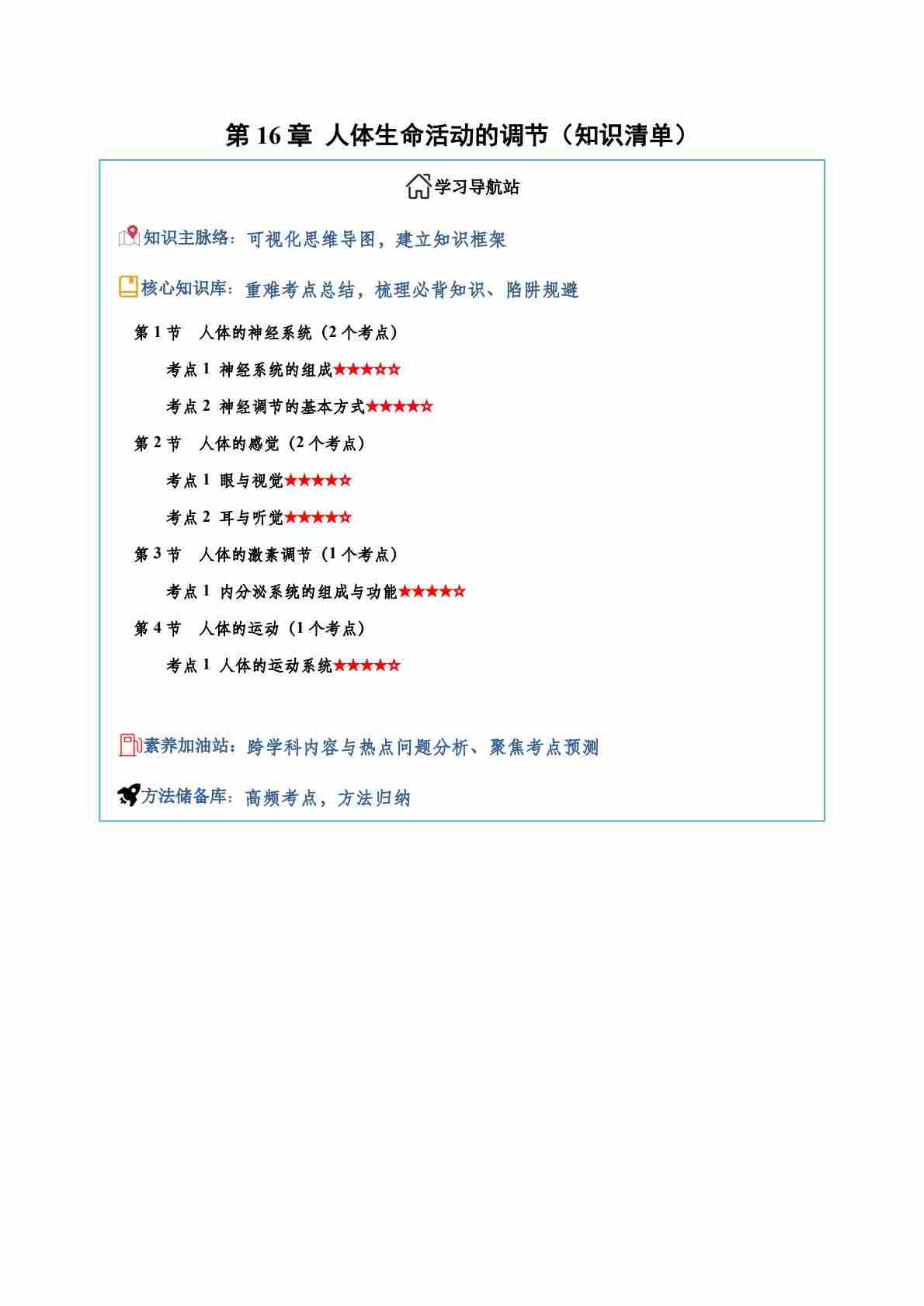 第16章 人体生命活动的调节(知识清单)(原卷版)
