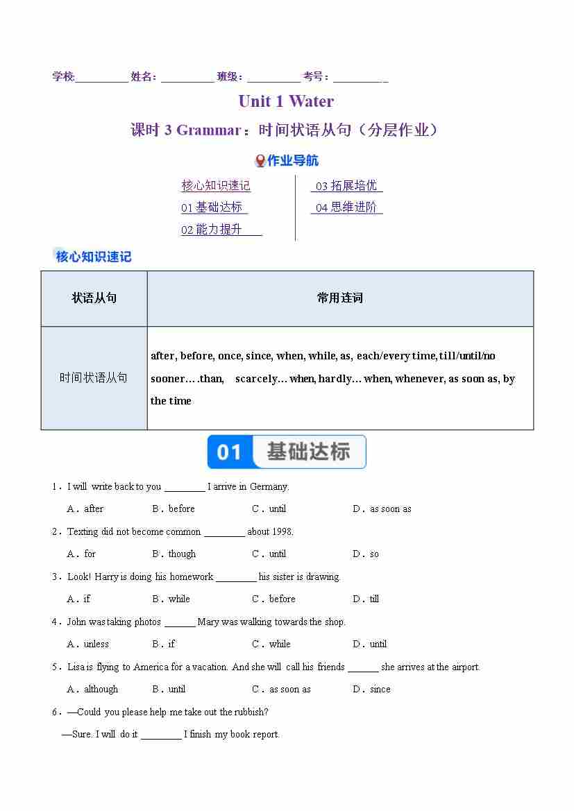 Unit 1 课时3 Grammar:时间状语从句(分层作业)(原卷版)