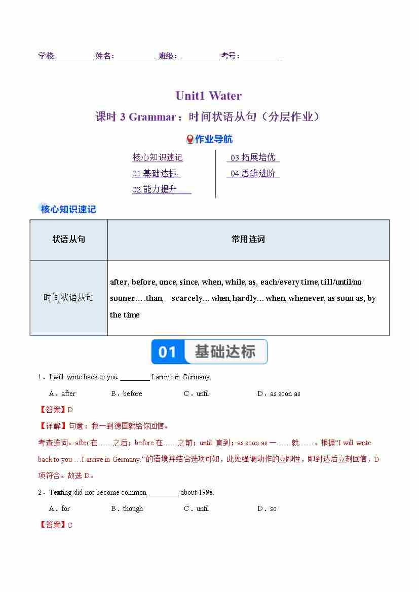 Unit 1 课时3 Grammar:时间状语从句(分层作业)(解析版)