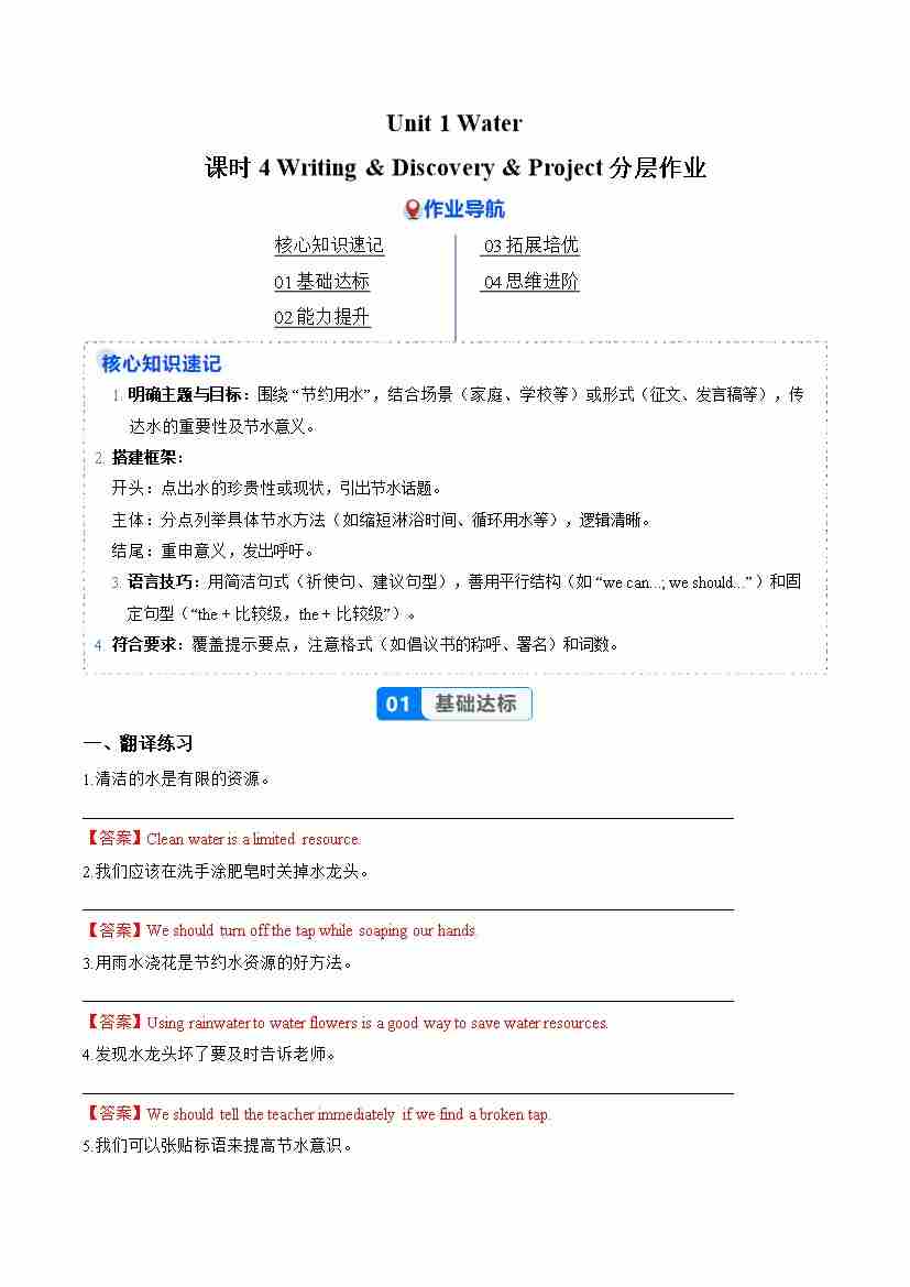 Unit 1 课时4 D Writing & Discovery & E Project(分层作业)(解析版)