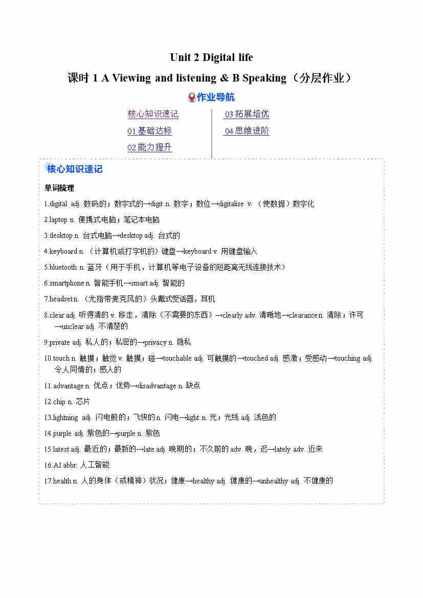 Unit 2 课时1 A Viewing and listening & B Speaking(分层作业)(原卷版)