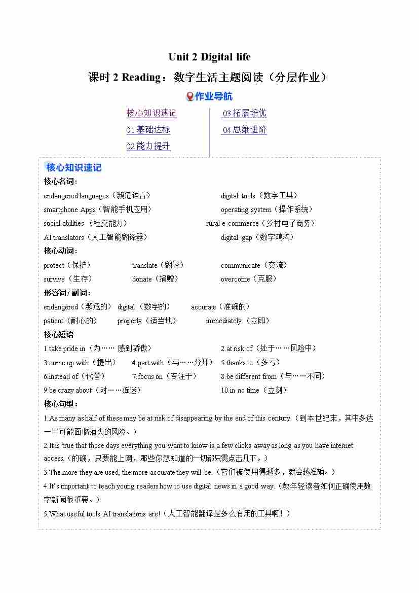 Unit 2 课时2 Reading(分层作业)(原卷版)