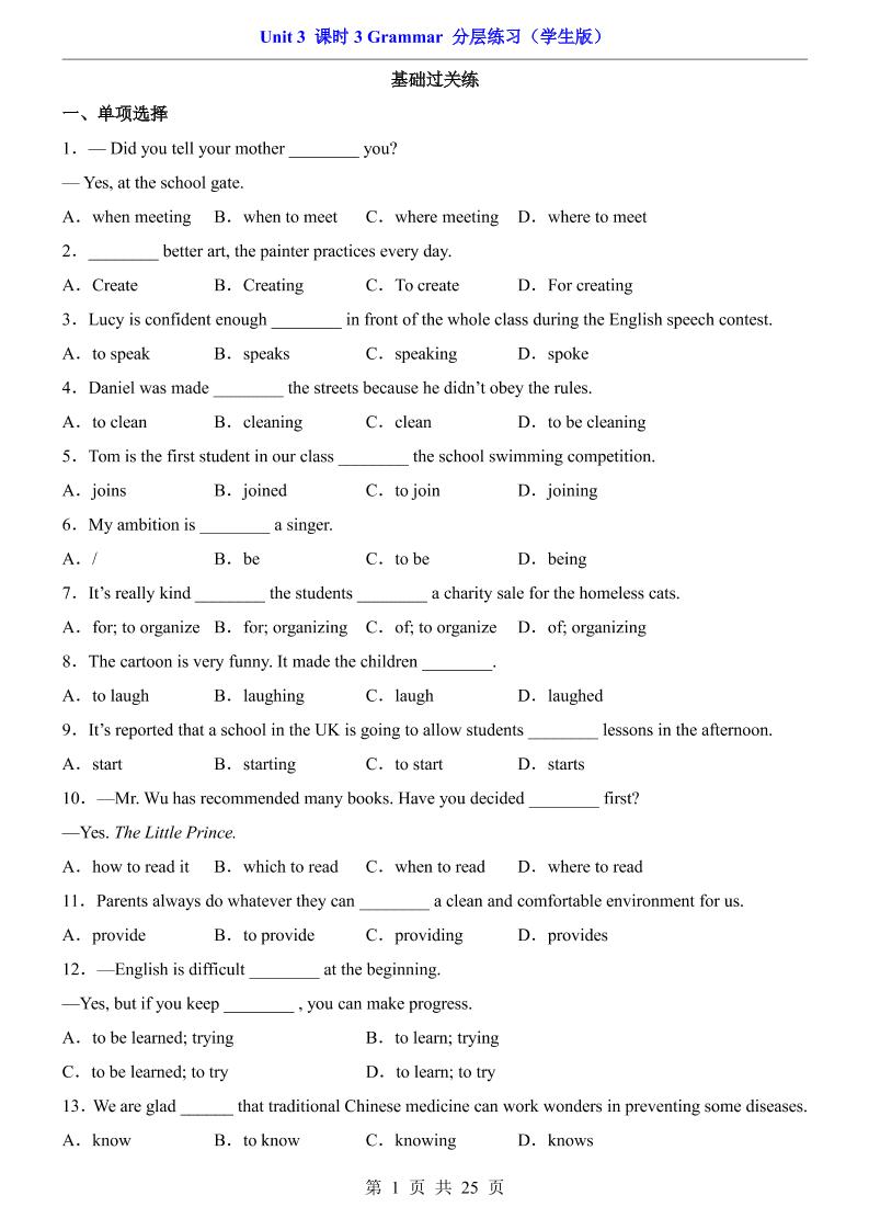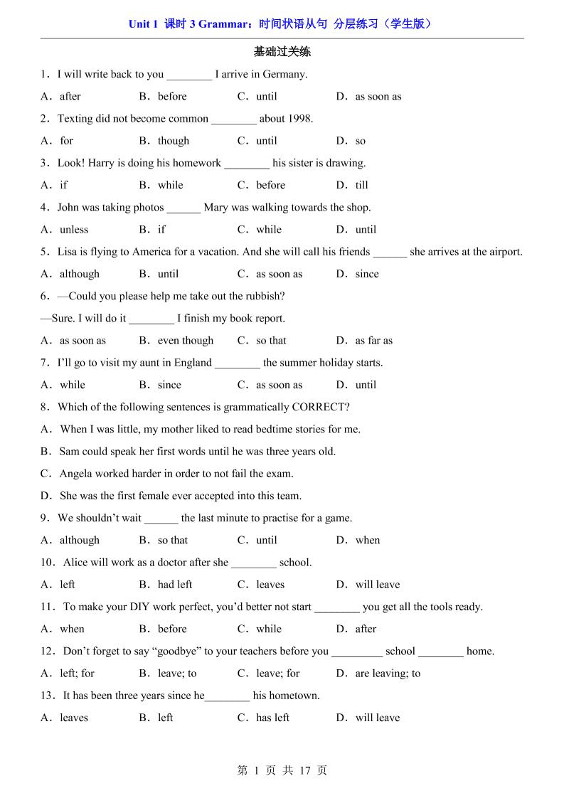 Unit 1 课时3 Grammar:时间状语从句(分层练习)