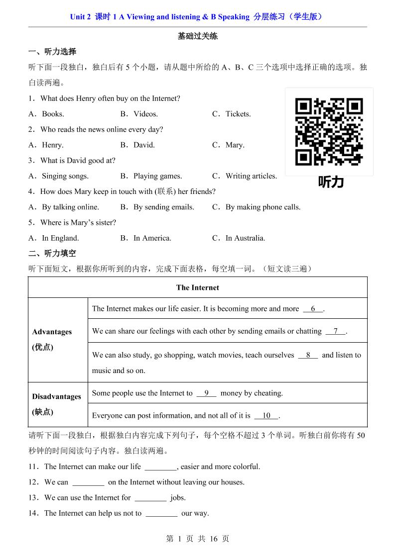 Unit 2 课时1 A Viewing and listening & B Speaking(分层练习)