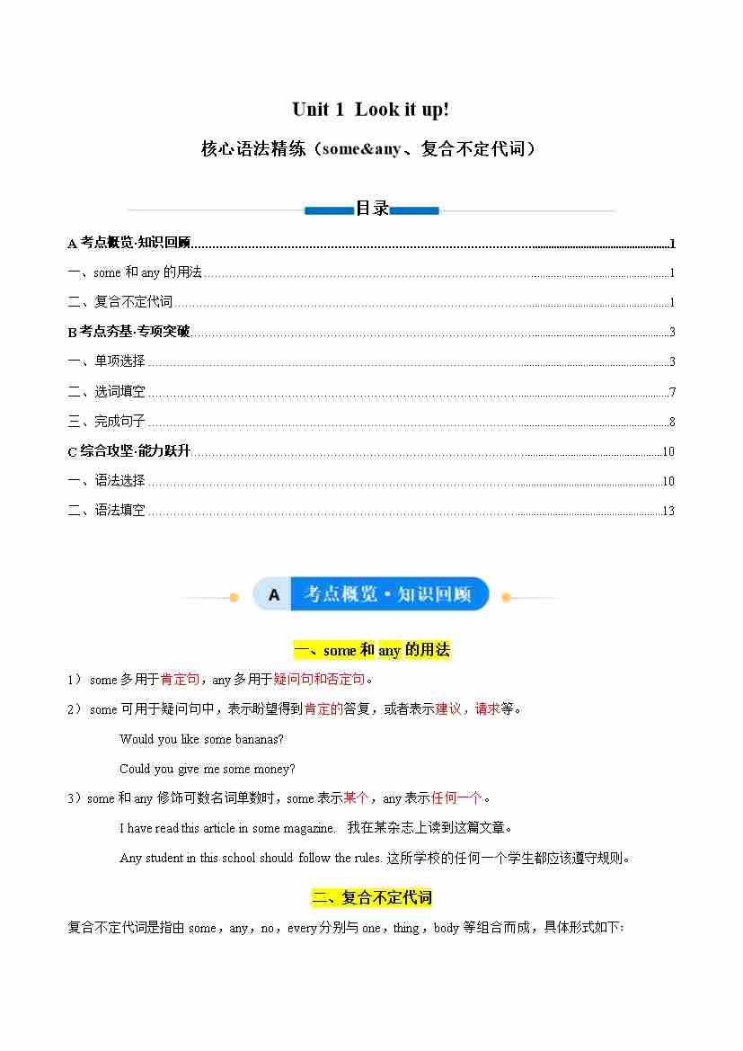 八上沪教.Unit 1 Look it up!(some &any 和复合不定代词)(单元核心语法精练)(解析版)