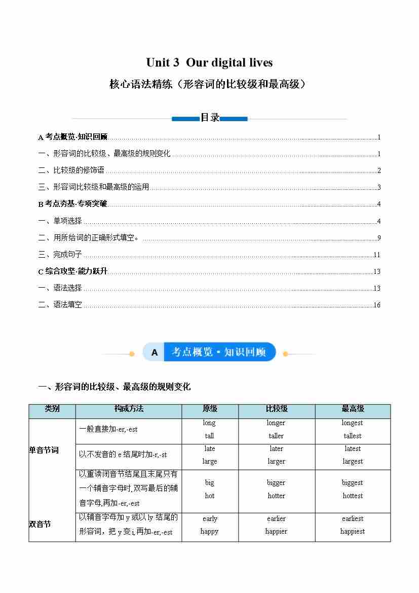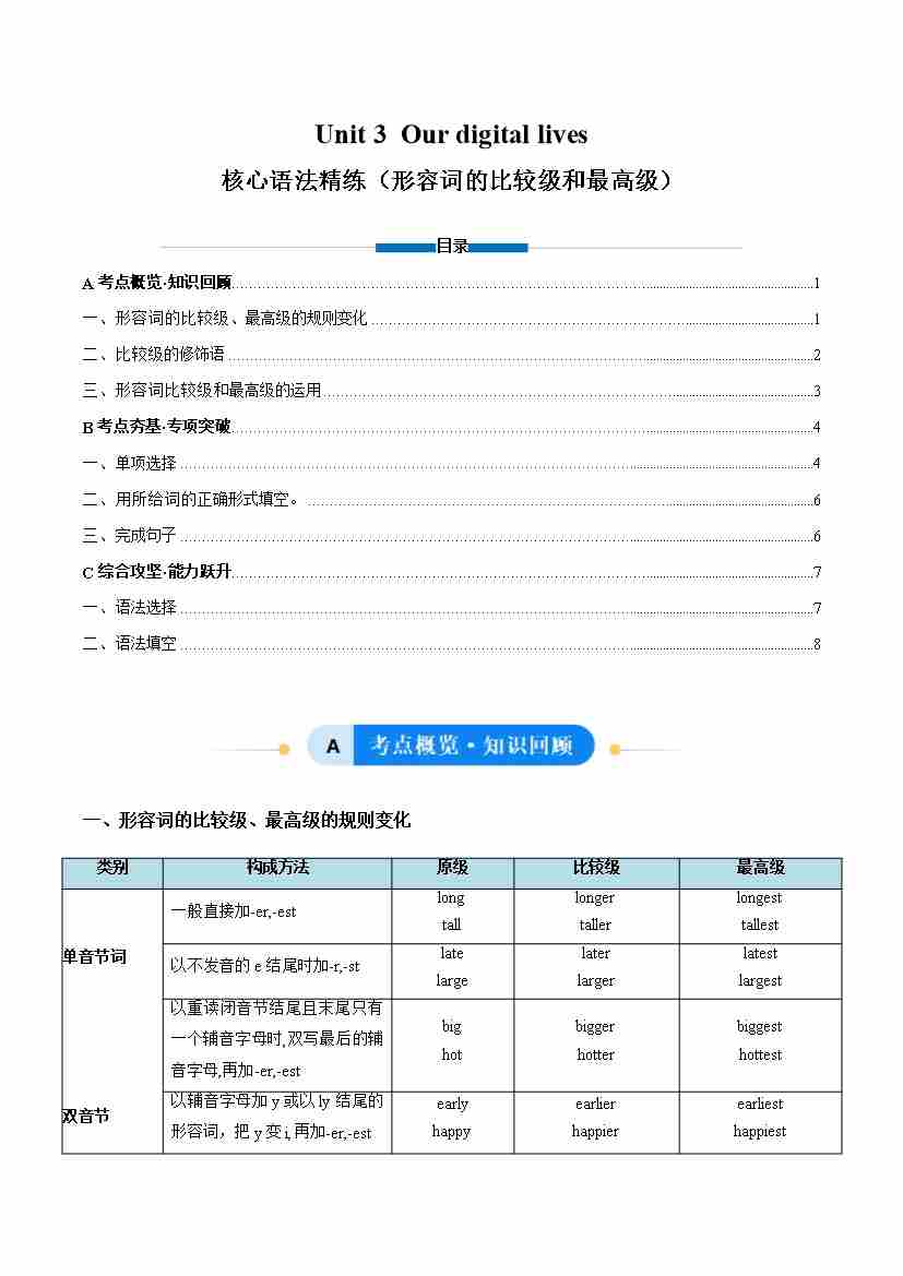 八上沪教.Unit 3 Our digital lives形容词的比较级和最高级(一)(单元核心语法精练)(原卷版)
