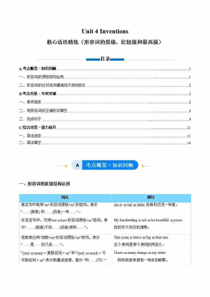 八上沪教.Unit 4 Inventions形容词的原级、比较级和最高级(二)(单元核心语法精练)(原卷版)