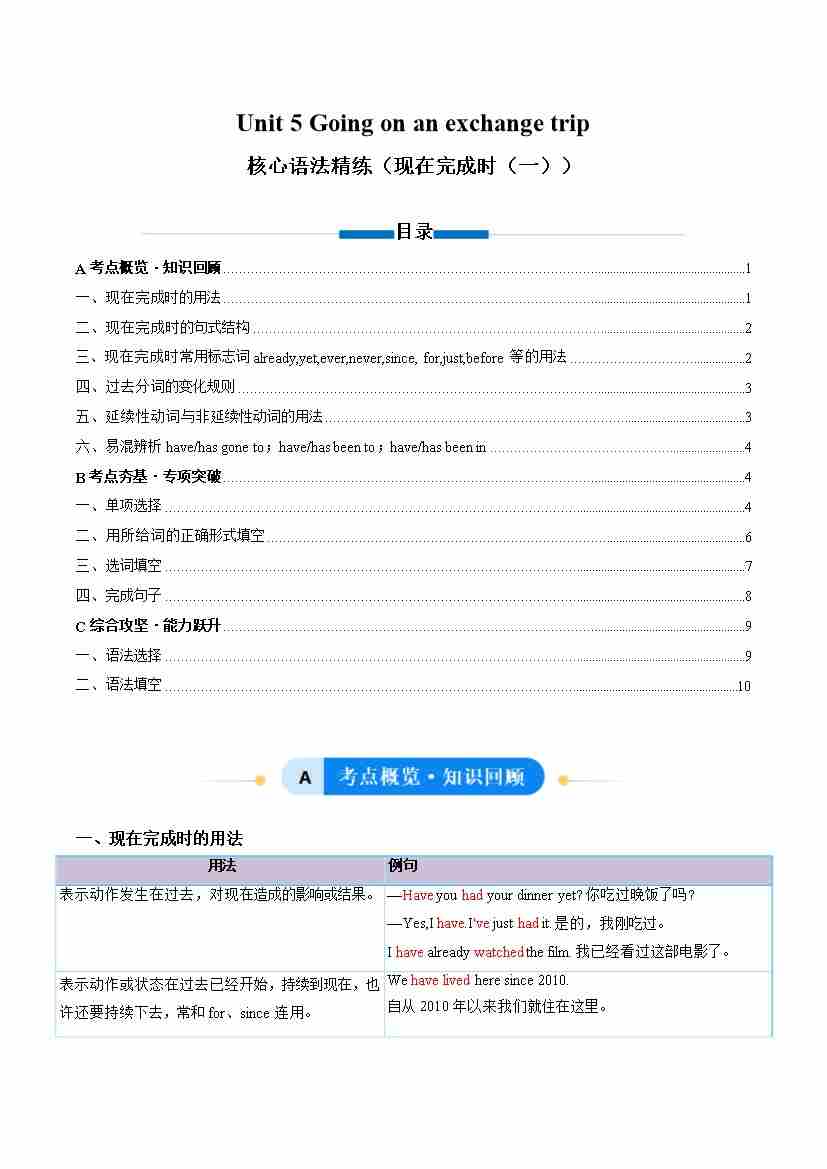八上沪教.Unit 5 Going on an exchange trip现在完成时(一)(单元核心语法精练)(原卷版)